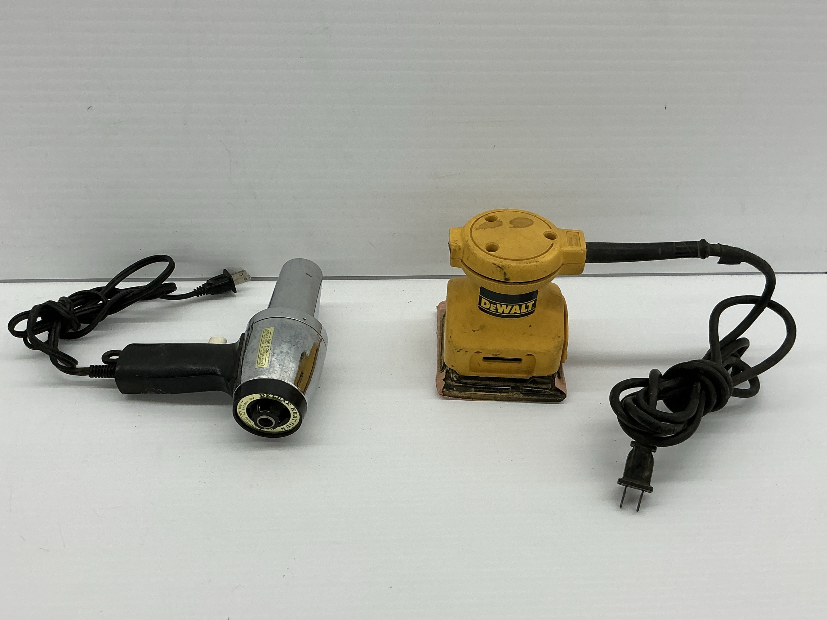 This auction includes a Deluxe Heat Gun and a Dewalt DW411 Palm Grip Sander. Both items are in used condition. See photos for more details.
