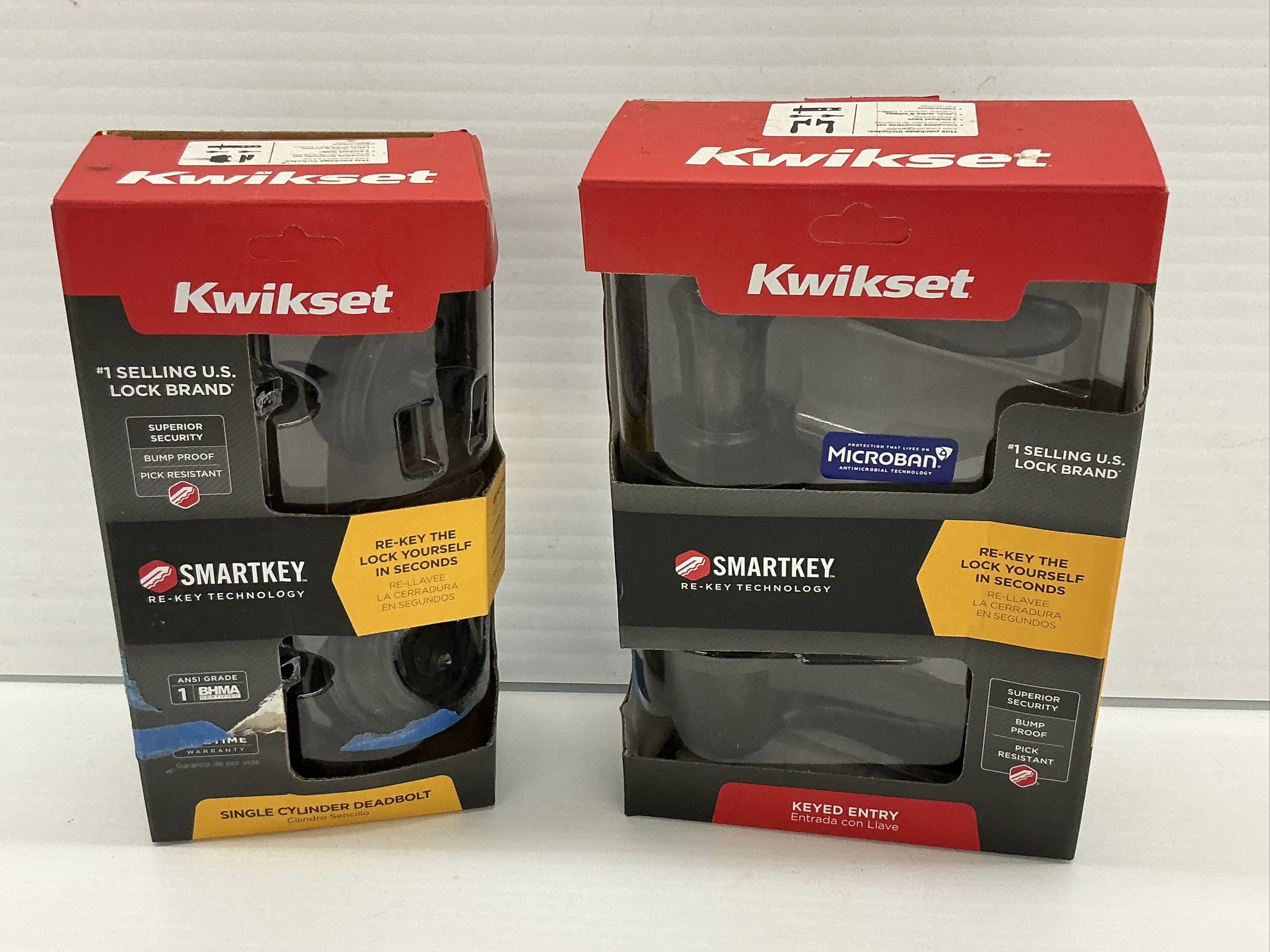 You are bidding on a lot of two Kwikset lock sets. One is a SmartKey Signature Series single cylinder deadbolt, and the other is a SmartKey Signature Series keyed entry lock. Both are new in box and ready to install.