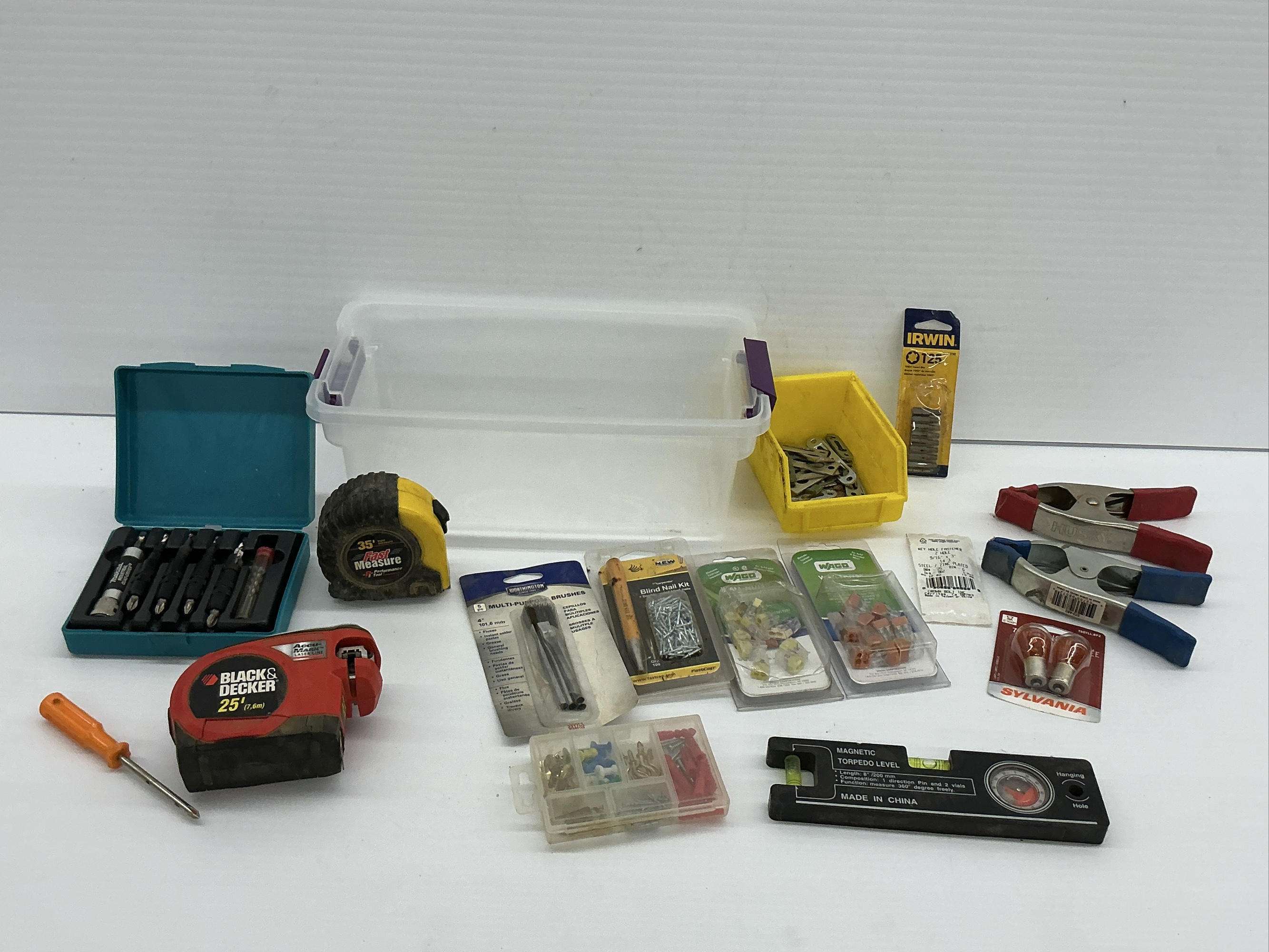This lot contains a variety of hand tools. Included is a Makita industrial quad driver bit set, a torpedo level, tape measures, wall nuts, key hole fasteners, clamps, and other accessories.