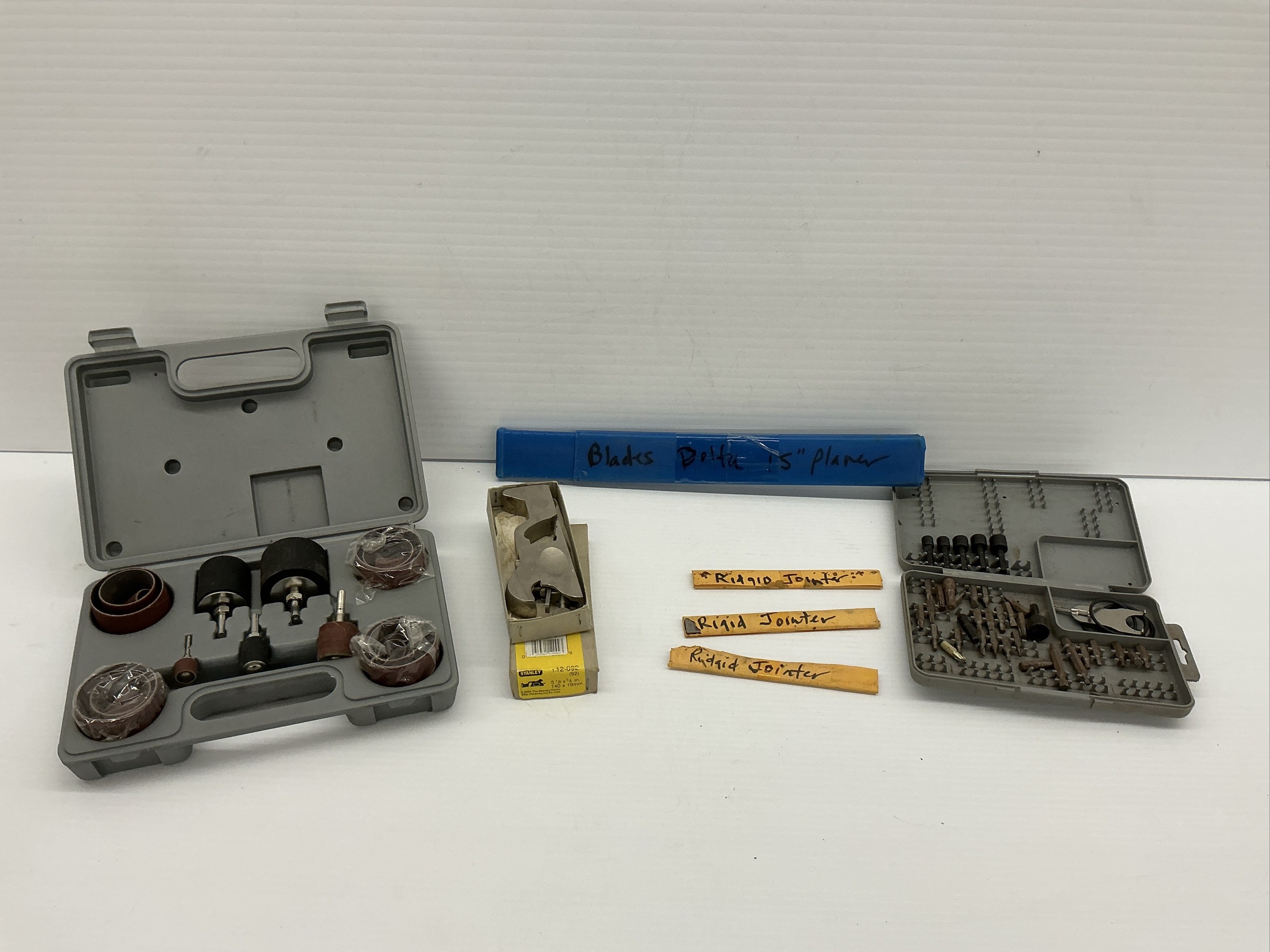 Tool and Accessories Lot: Delta Sanding Drum Kit, Driver Set, Delta Planer Blades, and Stanley Plane
