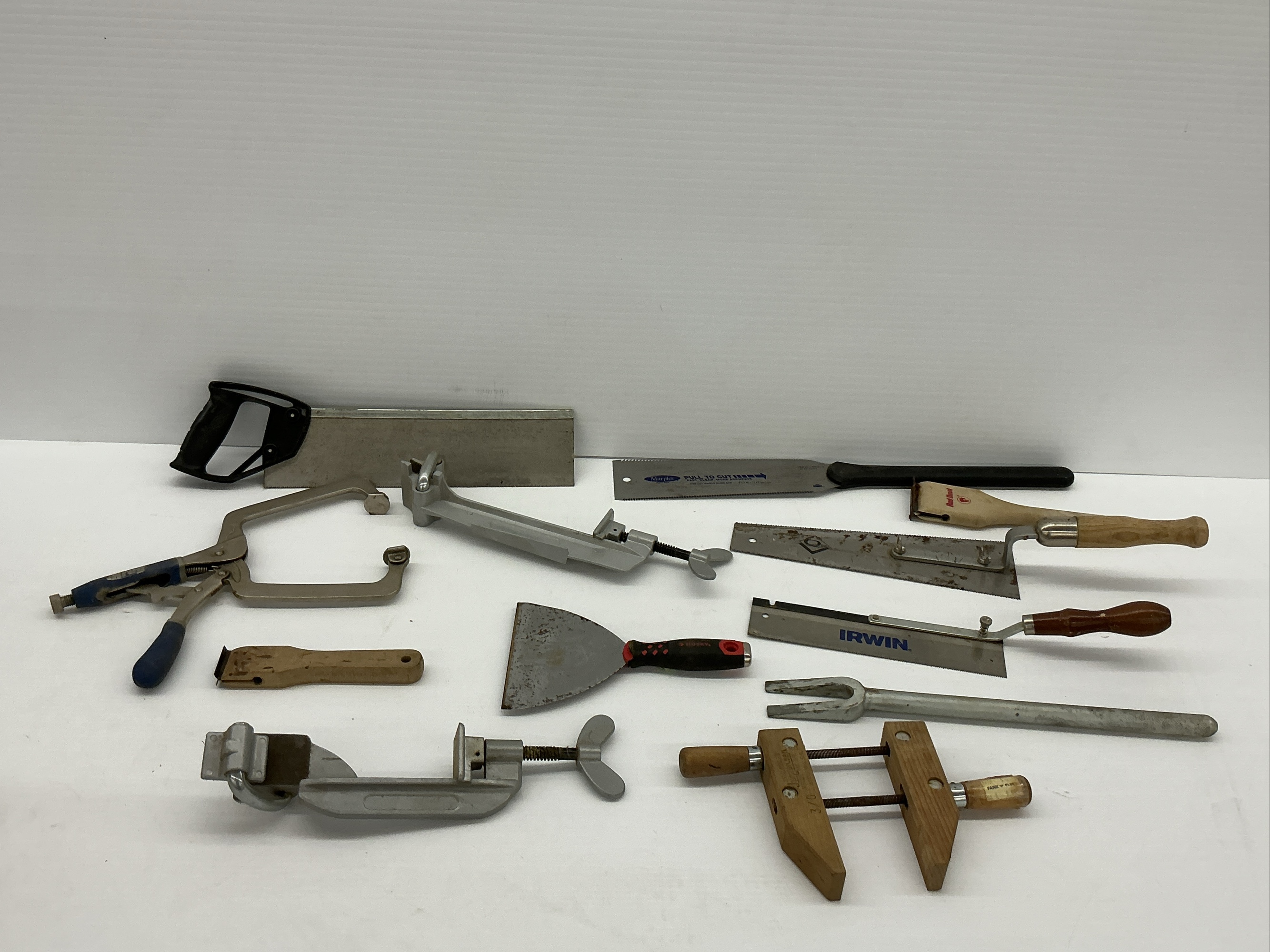 This lot contains a variety of hand tools, including saws, clamps, scrapers and more. Brands include Irwin. Perfect for any workshop or DIY enthusiast.