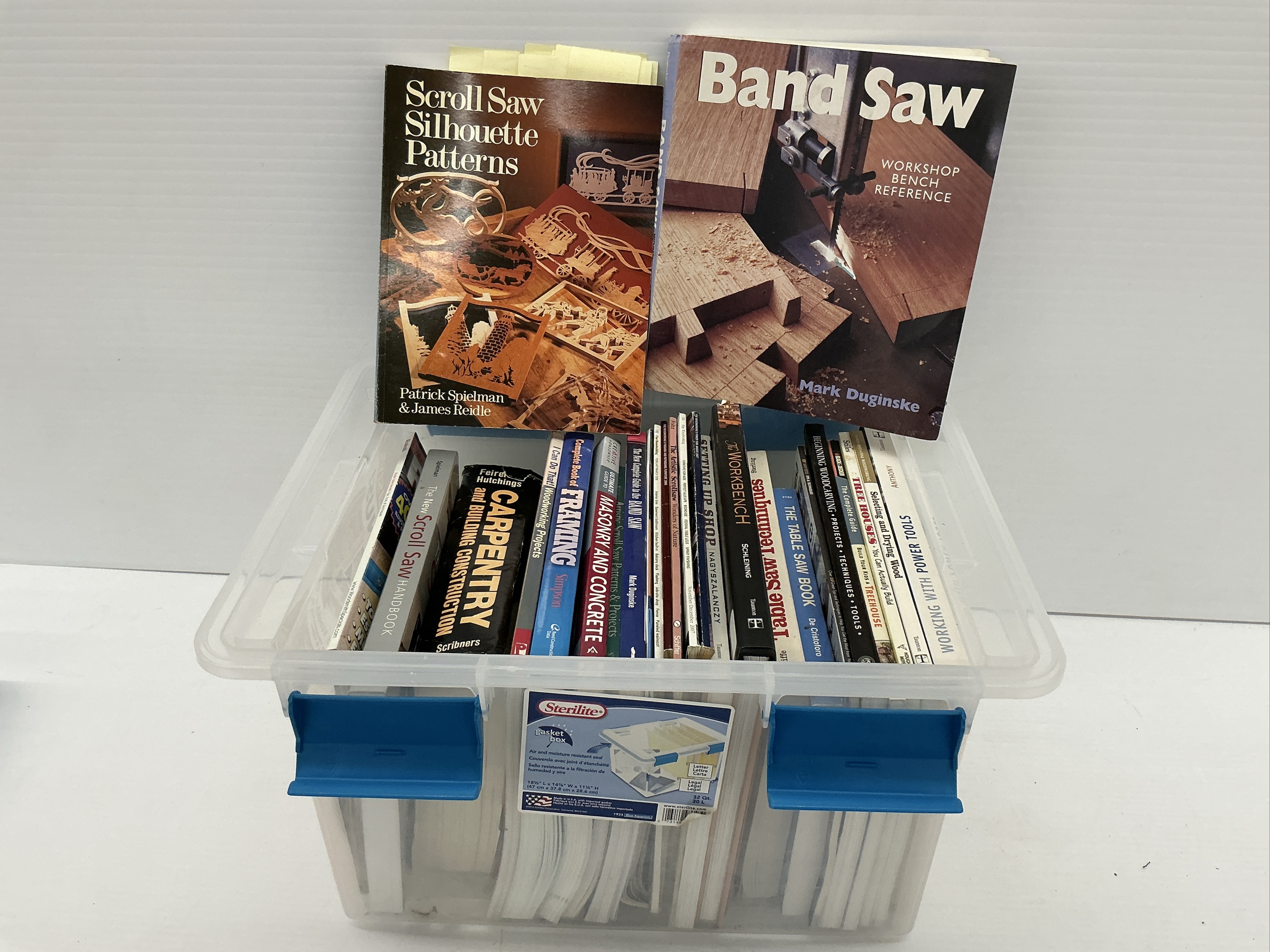 Collection of Woodworking and Construction Books in Sterilite Container