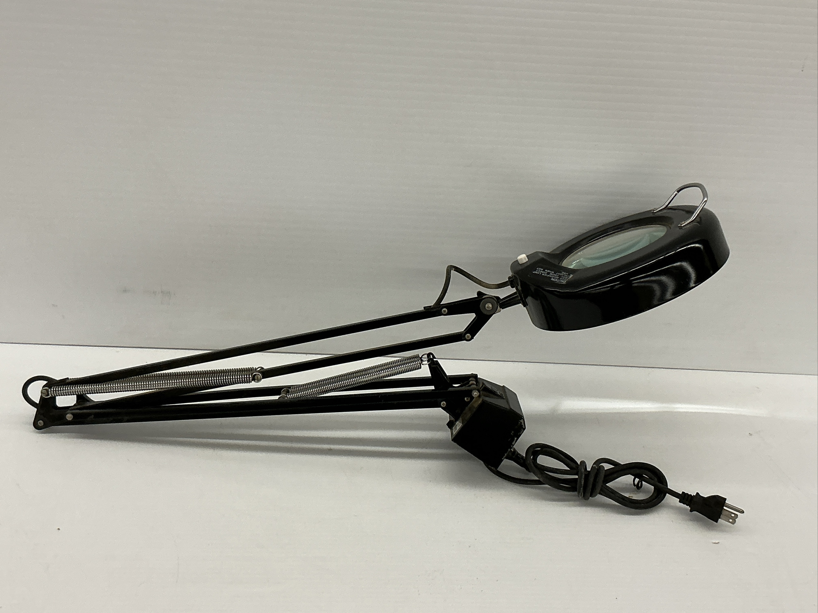 This is a black adjustable arm lamp with a magnifying glass and built-in circular fluorescent light. It is marked with a UL listing and the lamp is replaceable. Approx. 40 in.