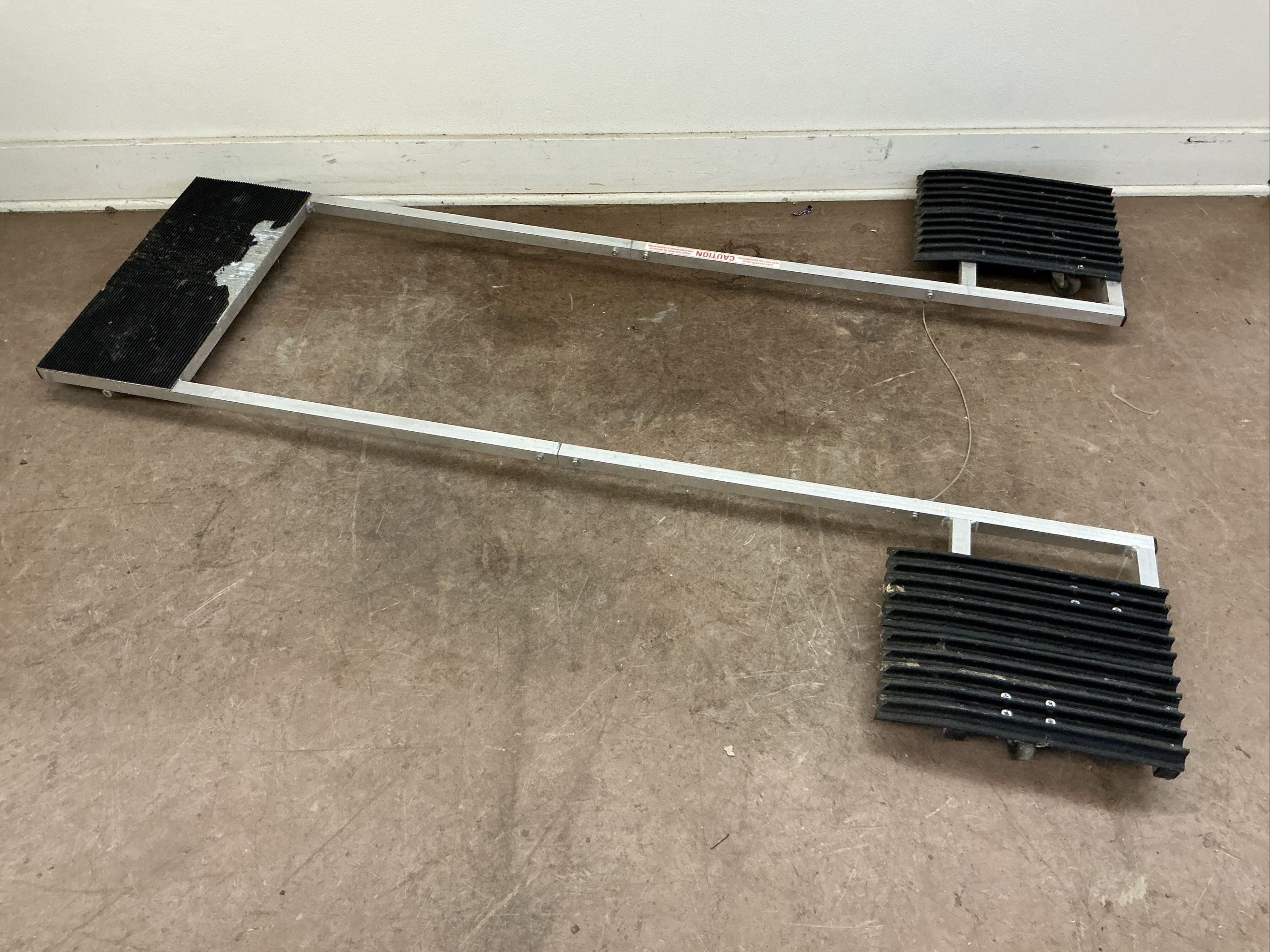 Machine dolly. It has seven wheels for easy rolling. 70 x 50 in.