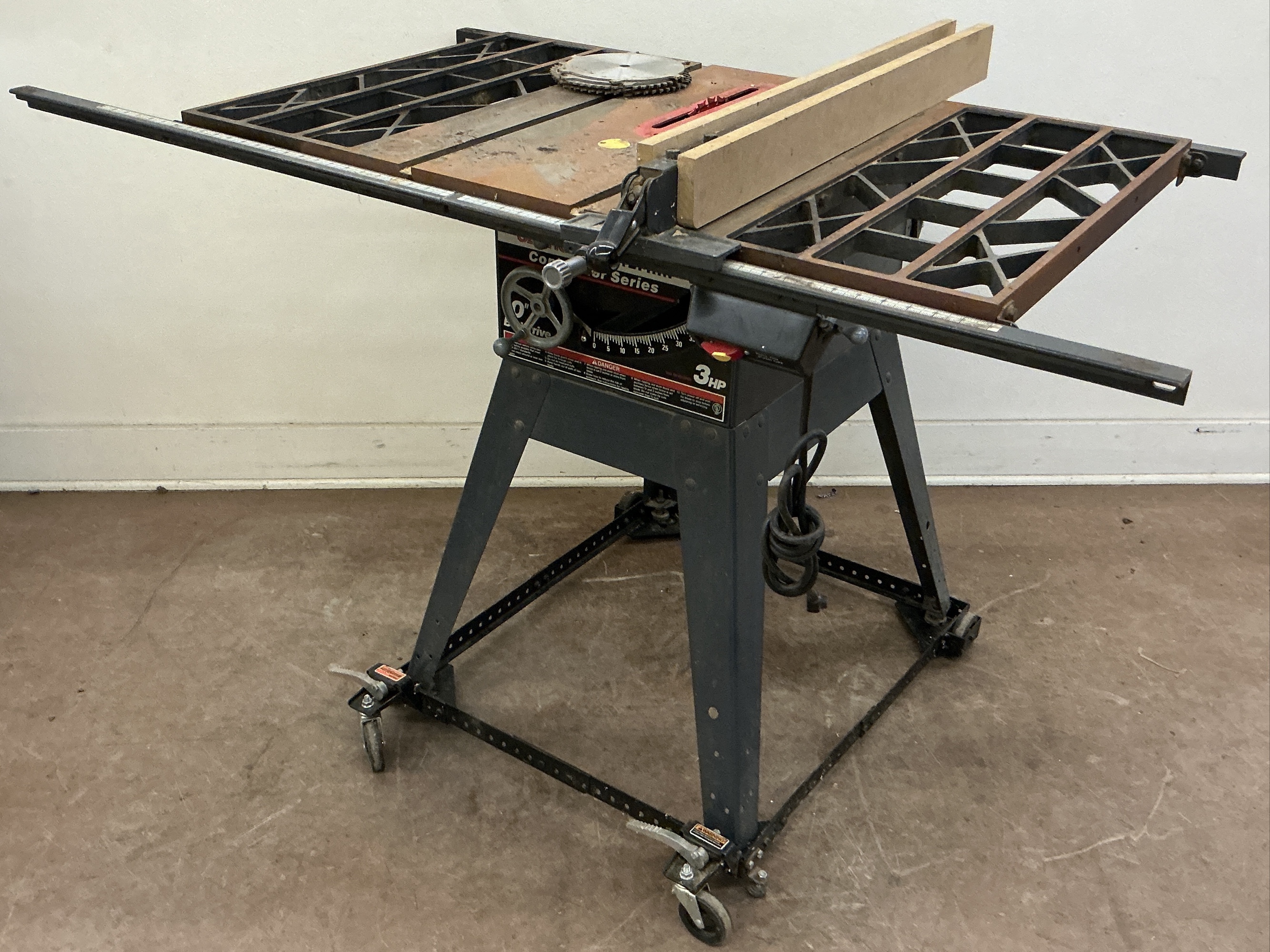 Craftsman Contractor Series 10-Inch Table Saw. Features a 3 HP motor, blade, adjustable fence, and stand with wheels. 41 x 63 x 44 in.