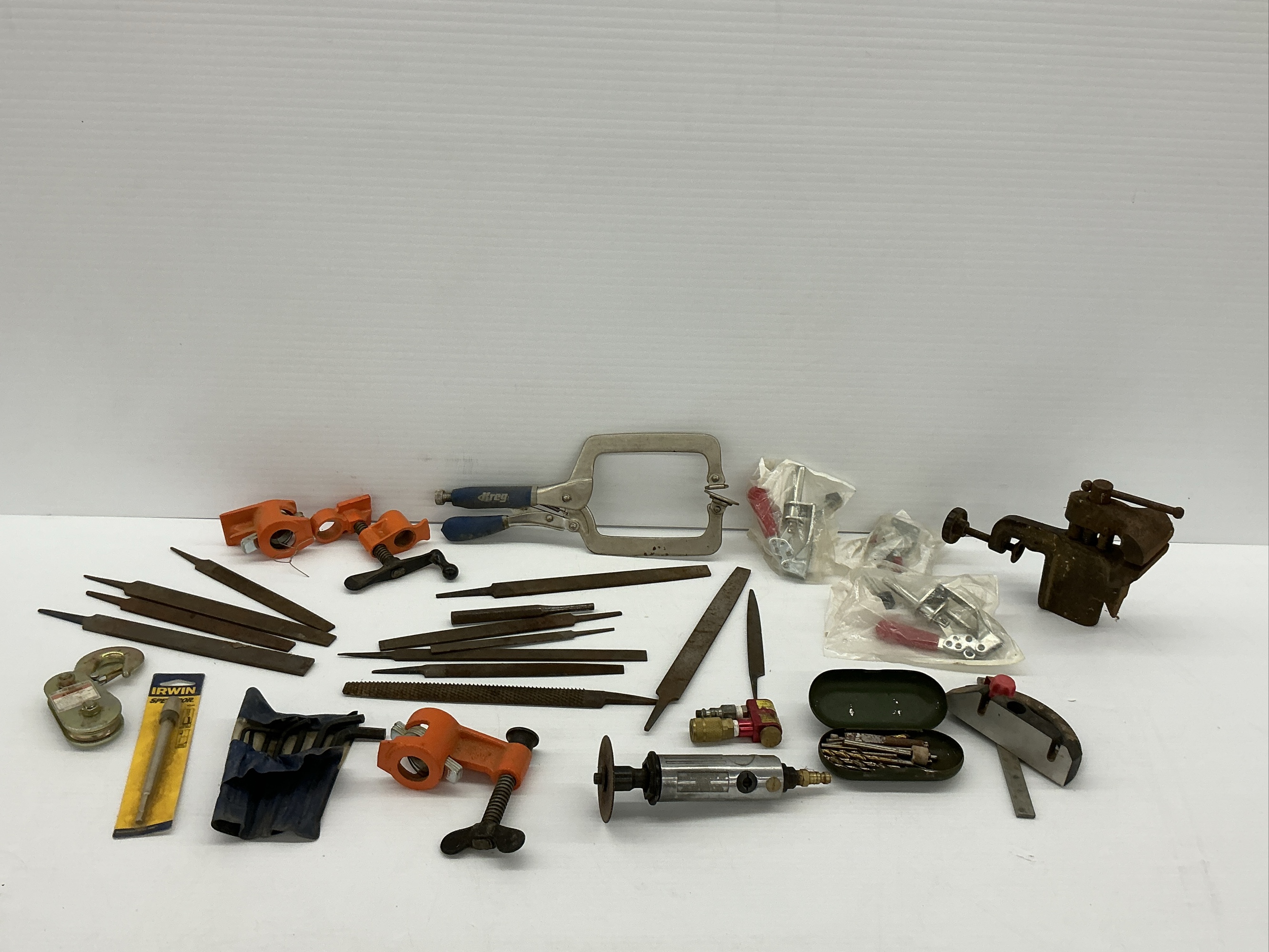 Mixed Lot of Tools Including Files, Clamps, and Accessories