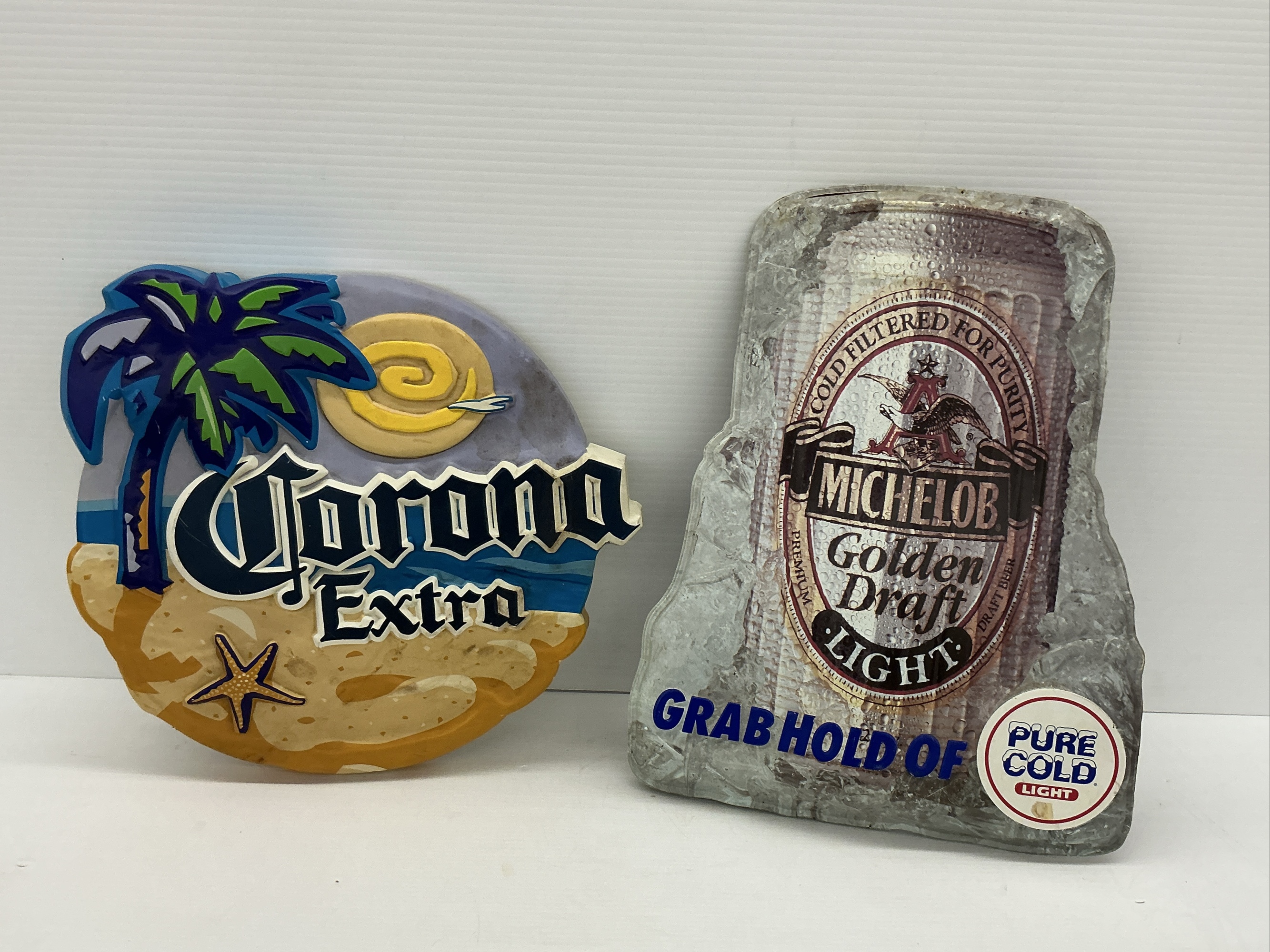 Two signs. One Corona Extra sign and one Michelob Golden Draft Light sign. The Corona sign depicts a beach scene with a palm tree, sun, and starfish. The Michelob sign is shaped like a block of ice encasing a can of beer. Largest 24 x 19 in.