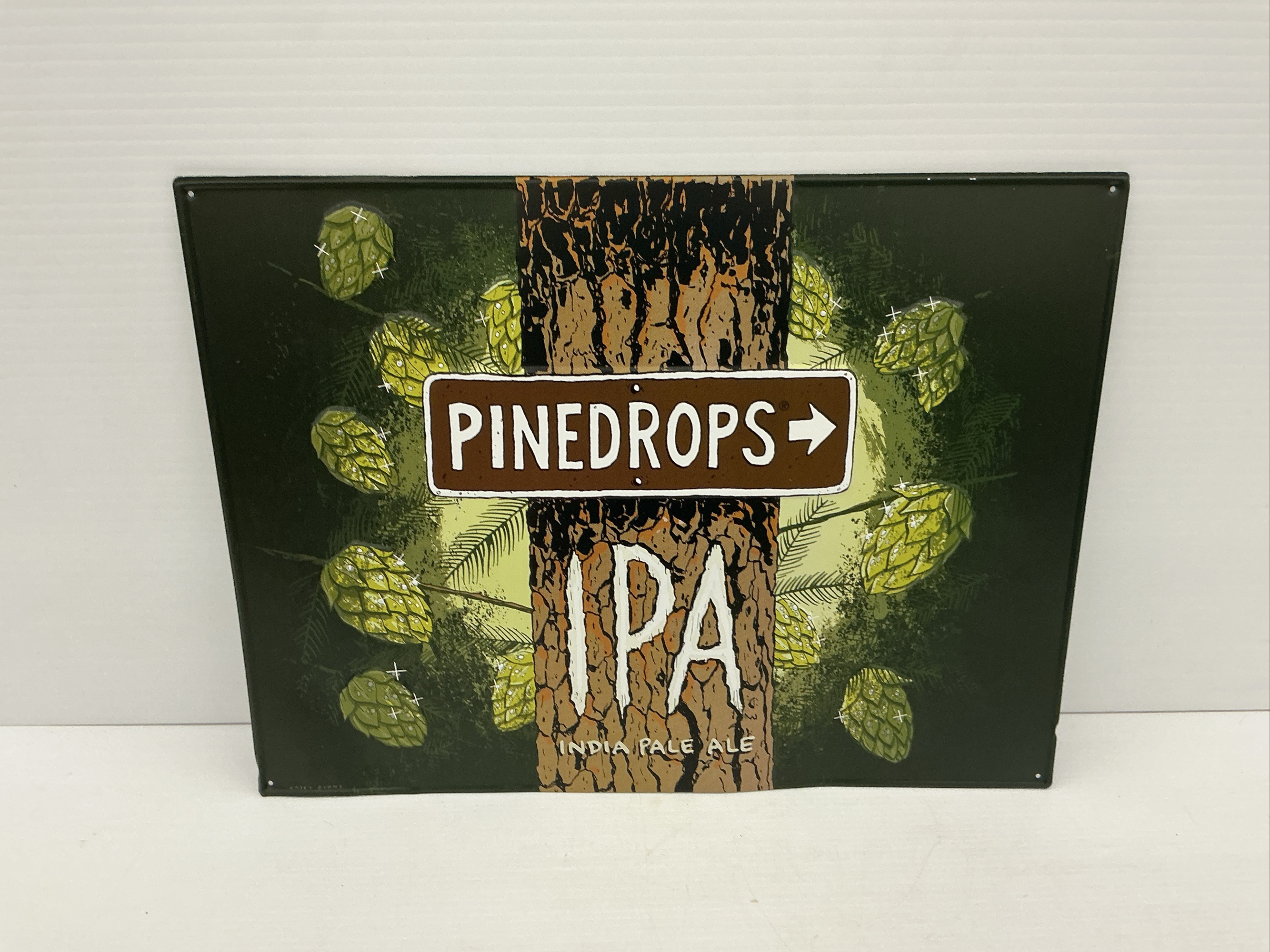Metal tacker sign advertising Pine Drops IPA beer. Measures approximately 24 x 18 in.