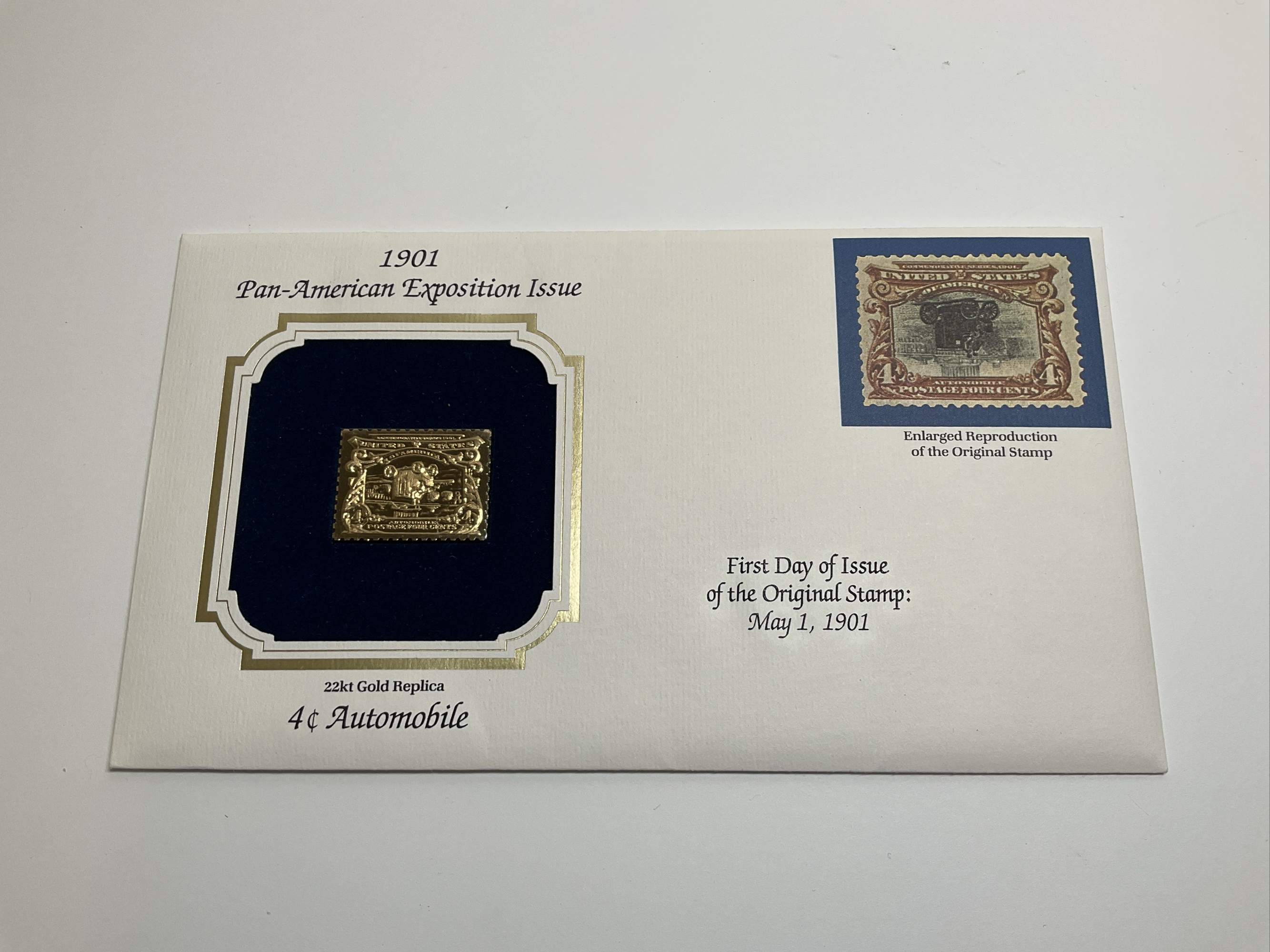 Commemorative 1901 Pan-American Exposition Issue gold replica of the original stamp. The replica is marked 22kt Gold and features a 4 cent automobile design.