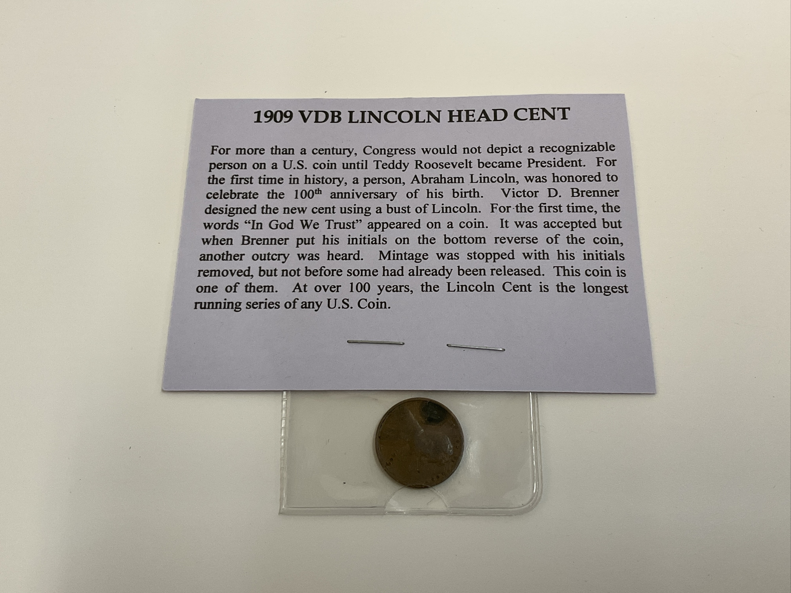 This is a 1909 VDB Lincoln Head Cent Penny. The coin is encapsulated and comes with information. The coin is a U.S. coin.