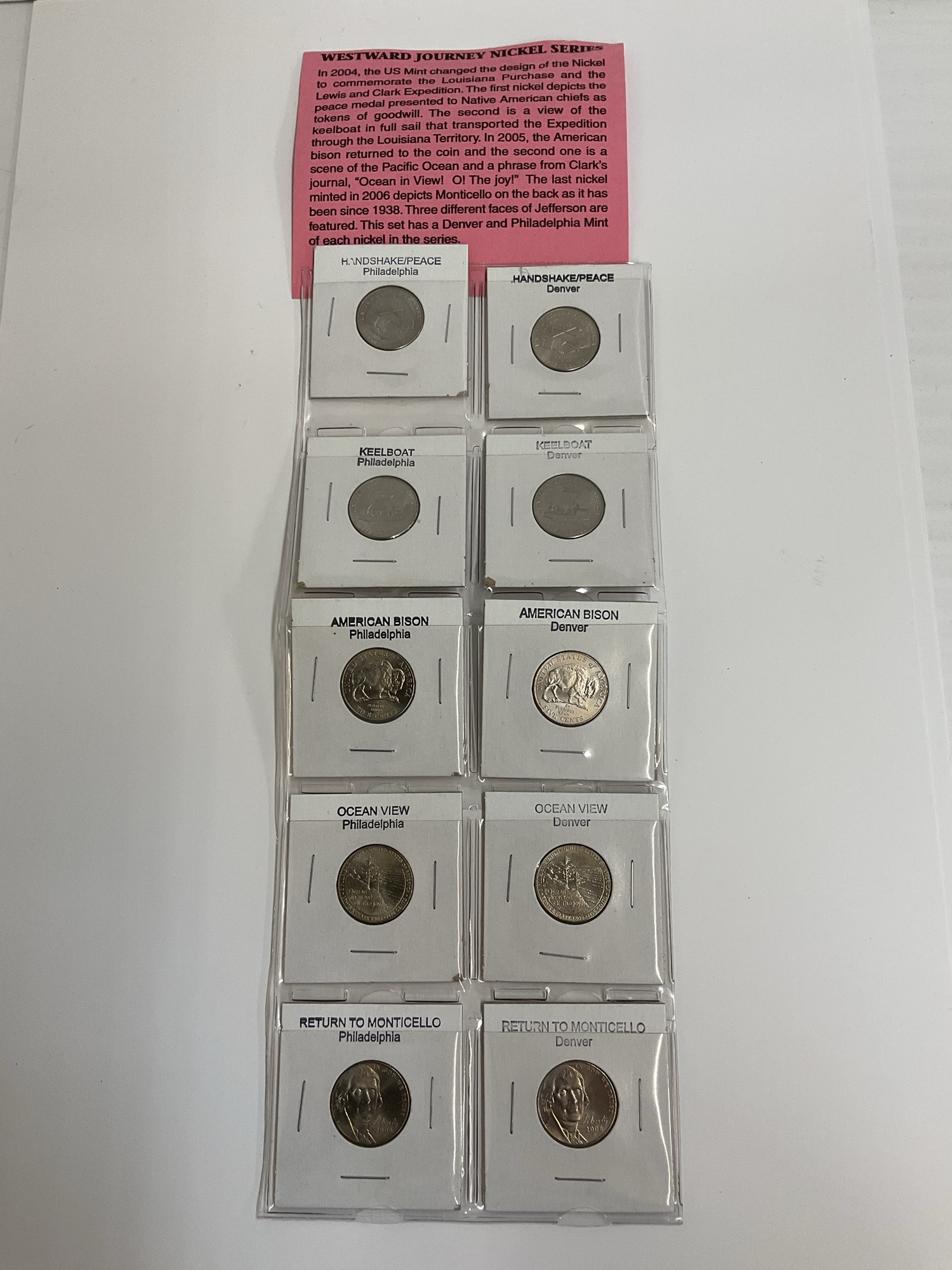 Complete set of Westward Journey Nickel Series, includes both the Denver and Philadelphia Mint issues for each design. Each set is housed in individual protective cases within a larger case.