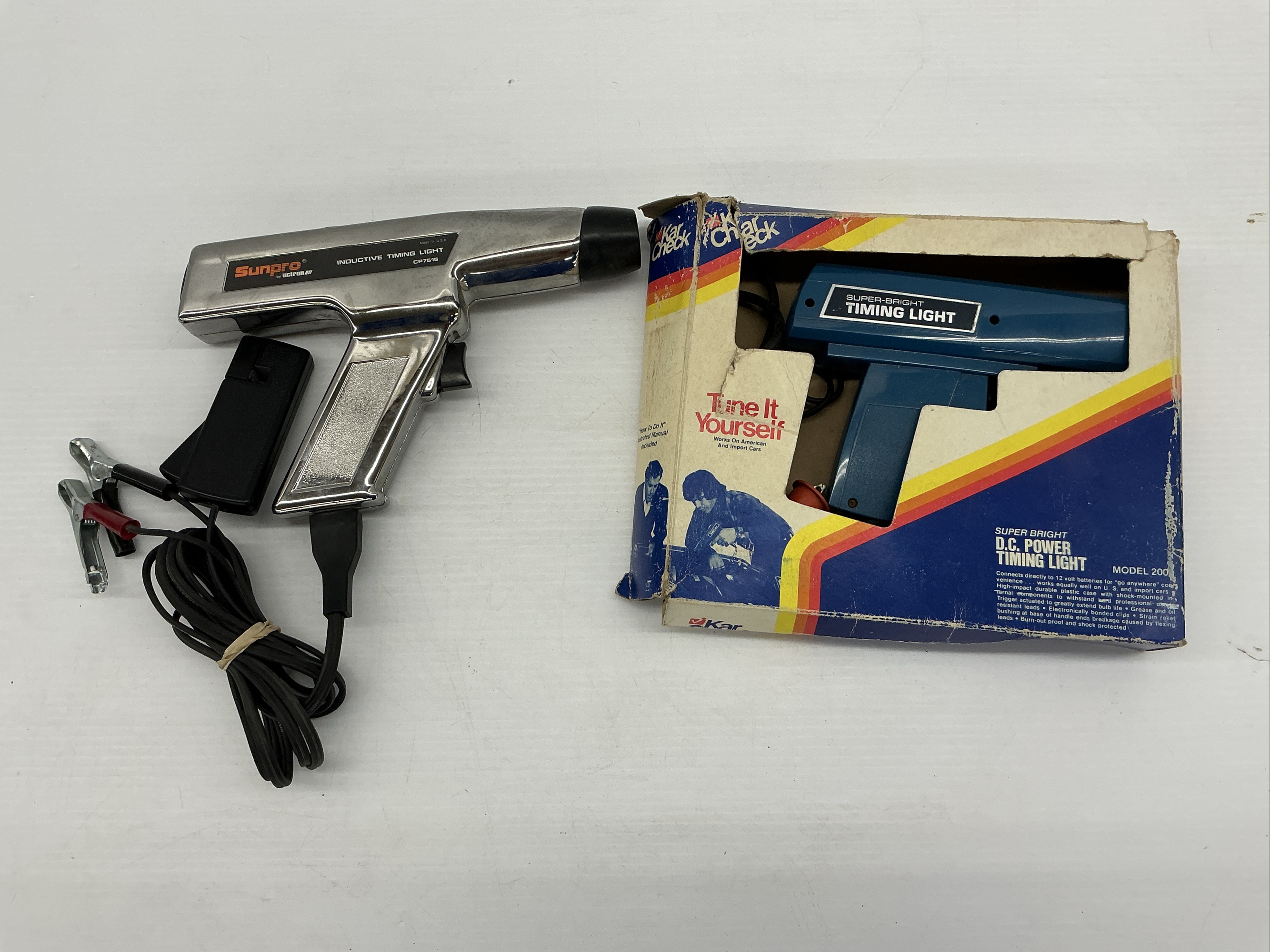 Two automotive timing lights including a Sunpro CP7515 Inductive Timing Light and a Kar Check Super Bright D.C. Power Timing Light Model 200. The Kar Check light comes with its original box and manual.