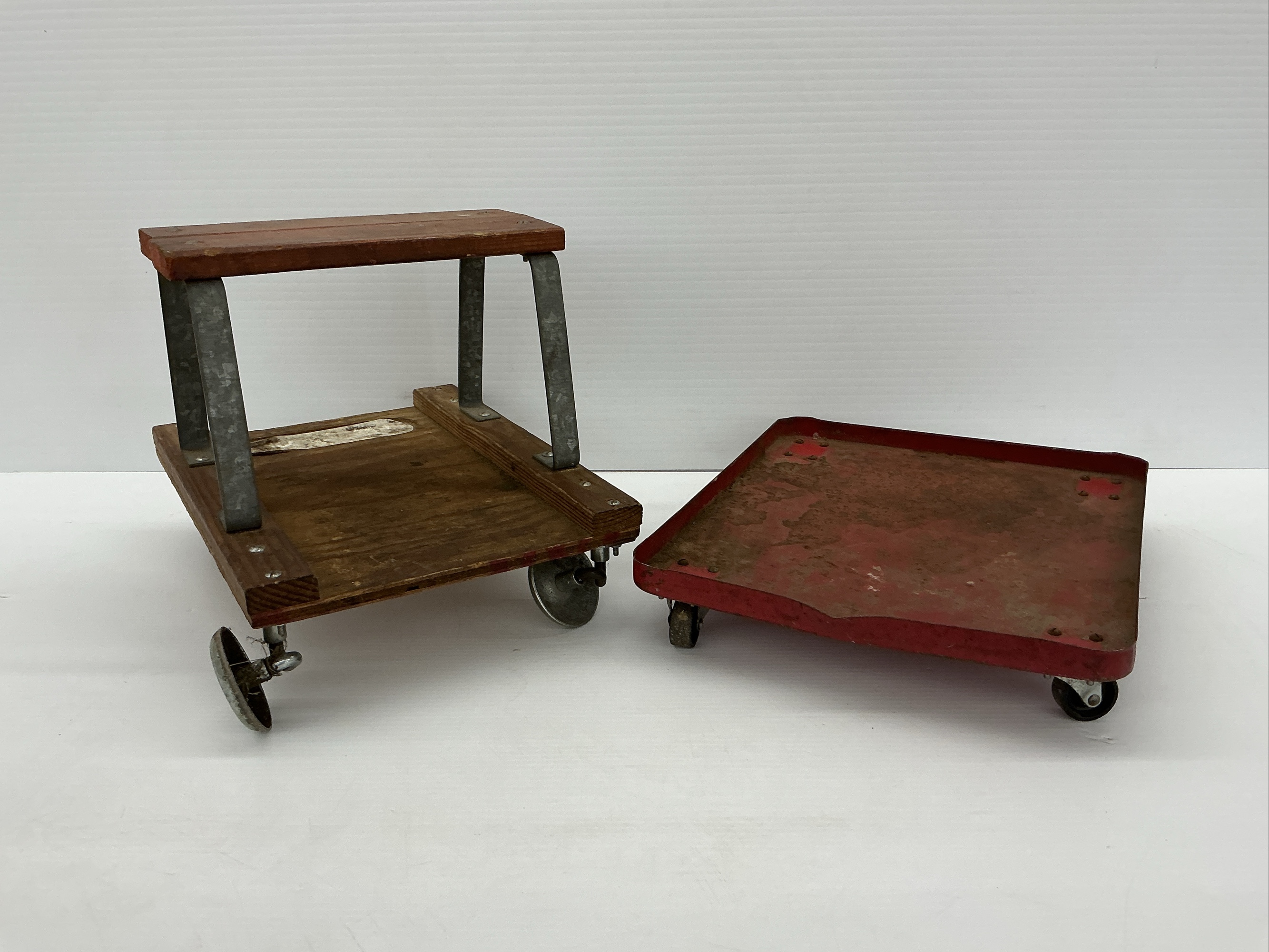 This lot features two rolling dollies. One dolly is a red, square metal platform with four caster wheels (16 x 14 in.). The other is a wooden platform with metal legs and a top handle, also equipped with four wheels (12 x 12 x 16 in.).