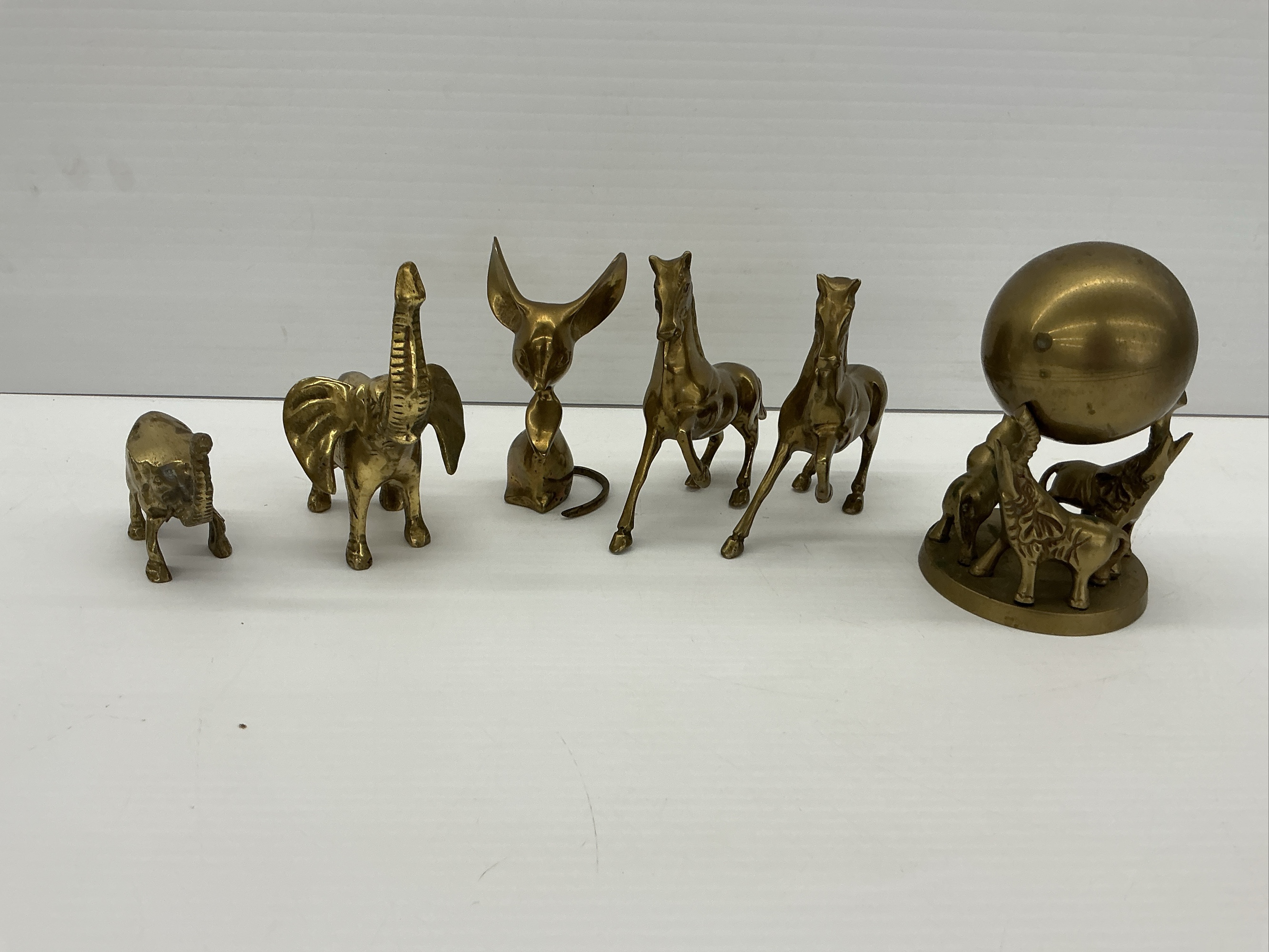 This auction features a charming collection of brass animal figurines. Included are two horses, three elephants (one on a globe display stand), and a mouse. These decorative items would add a touch of character to any home or office. Tallest 6 in.