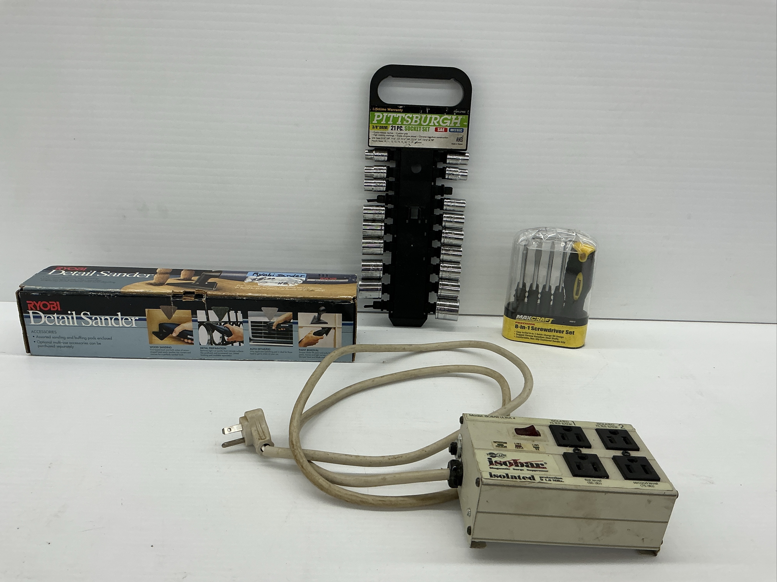 Ryobi Detail Sander, Pittsburgh Socket Set, Maxcraft Screwdriver Set and Surge Suppressor