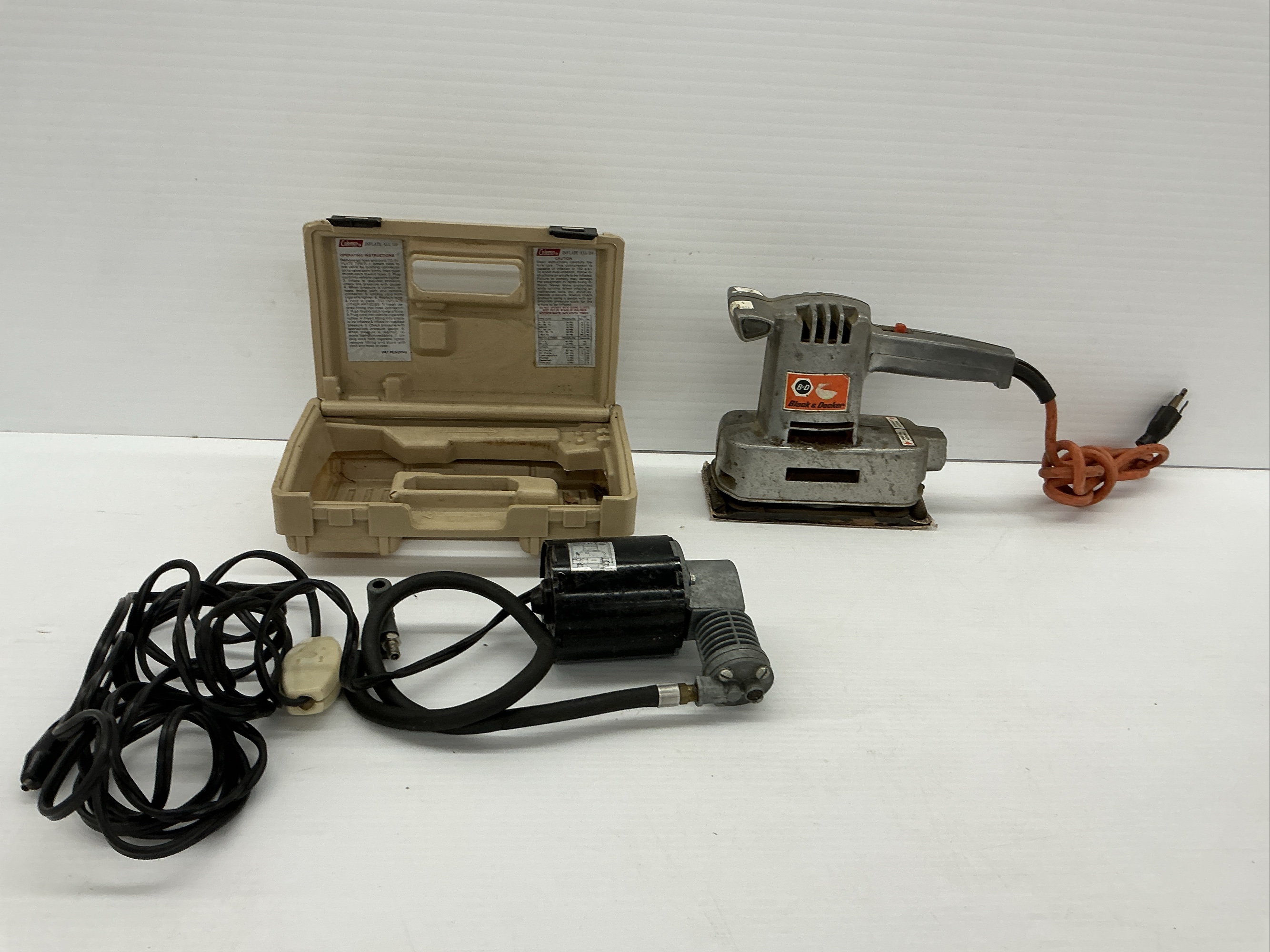 Includes a Black and Decker U-240 Deluxe Sander (works) and a Coleman Inflate-All 150 portable compressor.