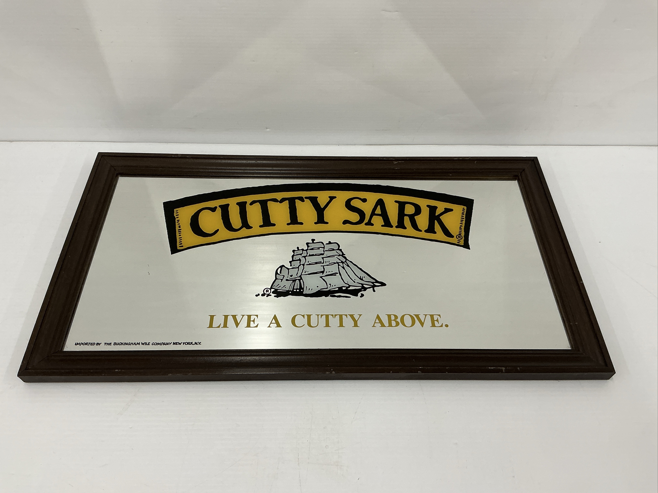 Framed advertising mirror featuring the Cutty Sark brand and logo, with the text "LIVE A CUTTY ABOVE." Imported by The Buckingham Wile Company New York, NY. 15 x 28 in.