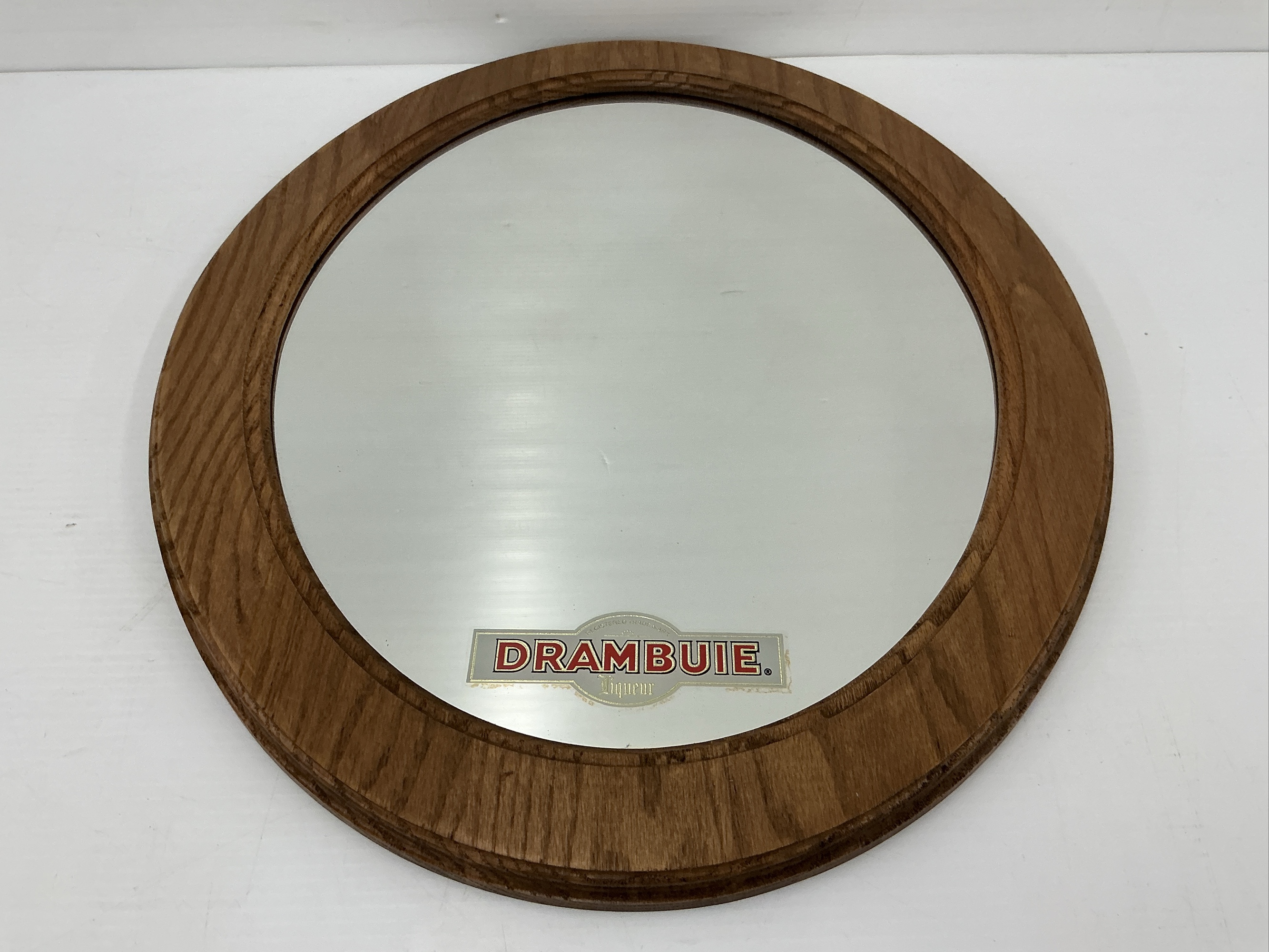 This is a Drambuie Liqueur mirror featuring a wood frame. The mirror has the Drambuie logo on the surface. It would be a great addition to a home bar or collection of advertising memorabilia. 24 x 20 in.