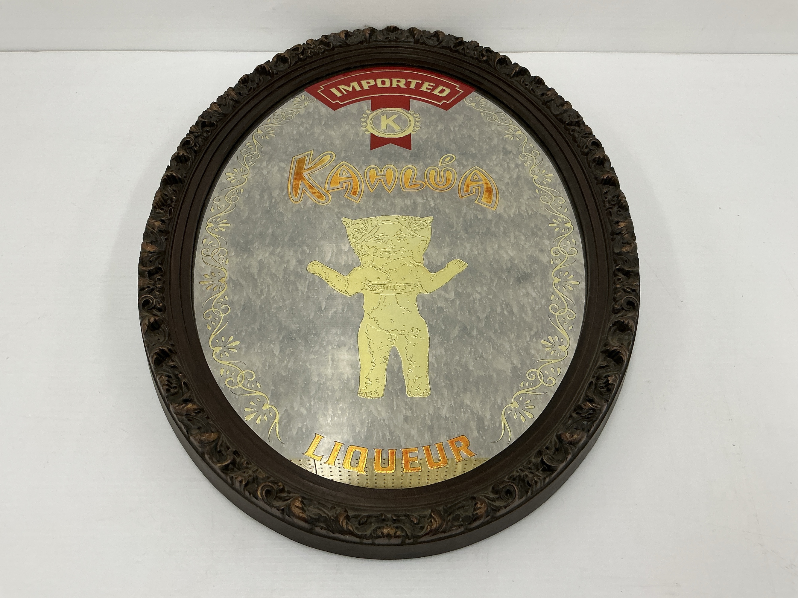 Ornate framed oval mirror advertising Kahlua Liqueur. Features the 'Imported' banner and Kahlua logo with a graphic of the Kahlua mascot. 26 x 18 in.