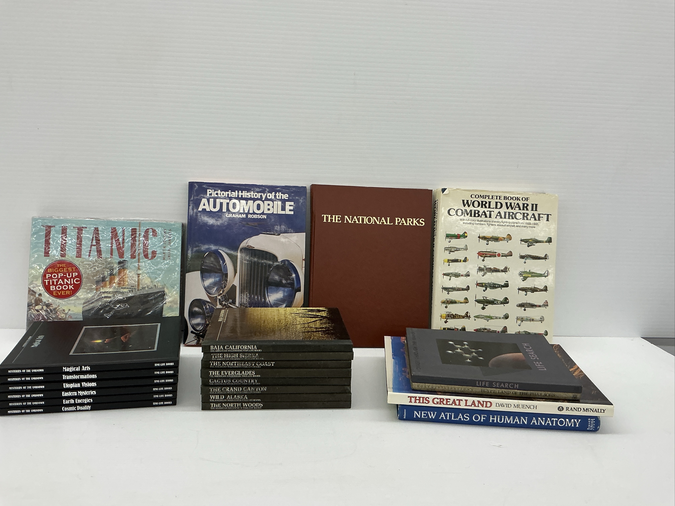 This lot includes a variety of books including Titanic Pop-Up, Pictorial History of the Automobile, The National Parks, Complete Book of WWII Combat Aircraft, Mysteries of the Unknown, The American Wilderness Time-Life Books, Life Search and New Atlas of Human Anatomy