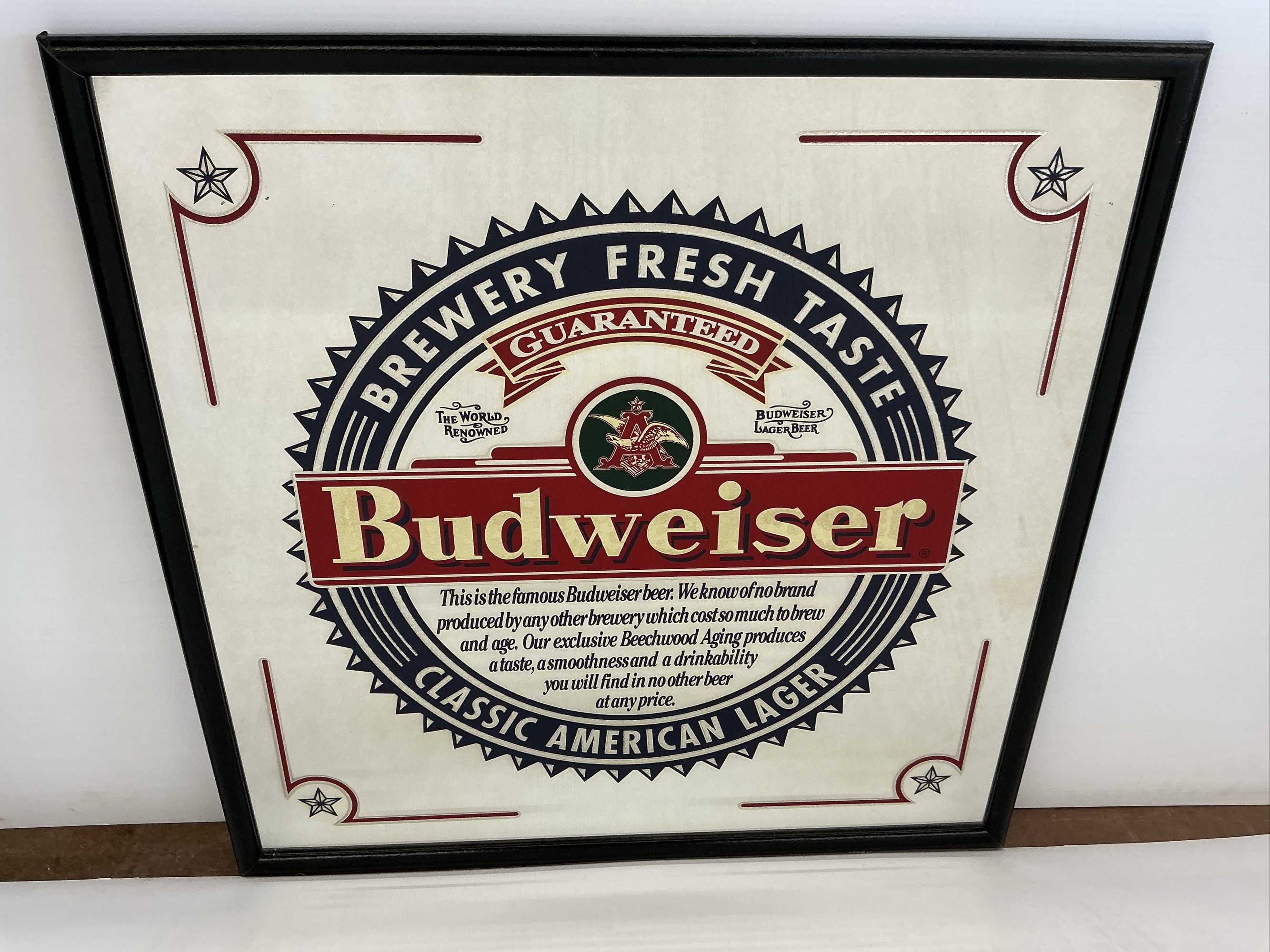 This auction features a framed Budweiser mirror. This mirror showcases the iconic Budweiser logo and the phrase "Brewery Fresh Taste Guaranteed". A great addition to any collection or bar area. 32 x 32 in.