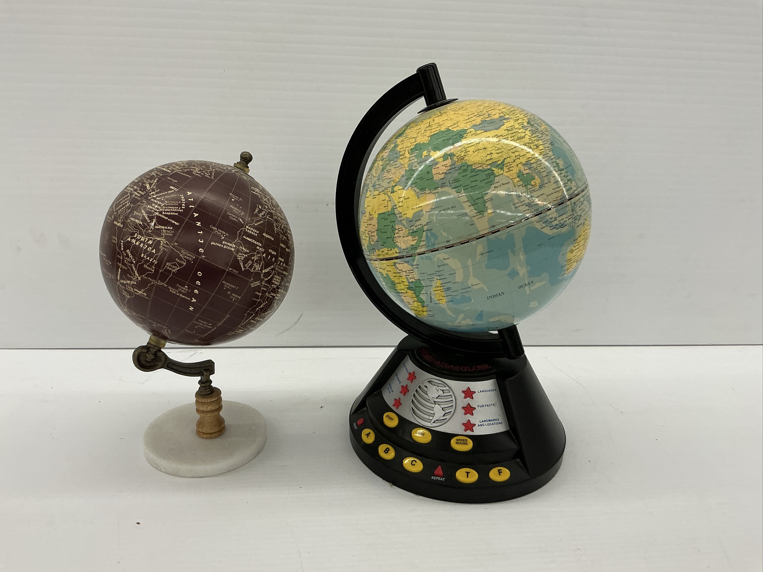 This lot features two world globes. One is an interactive world atlas globe with a black stand. The other is a brown decorative globe with a marble stand. Tallest measures 14 in.