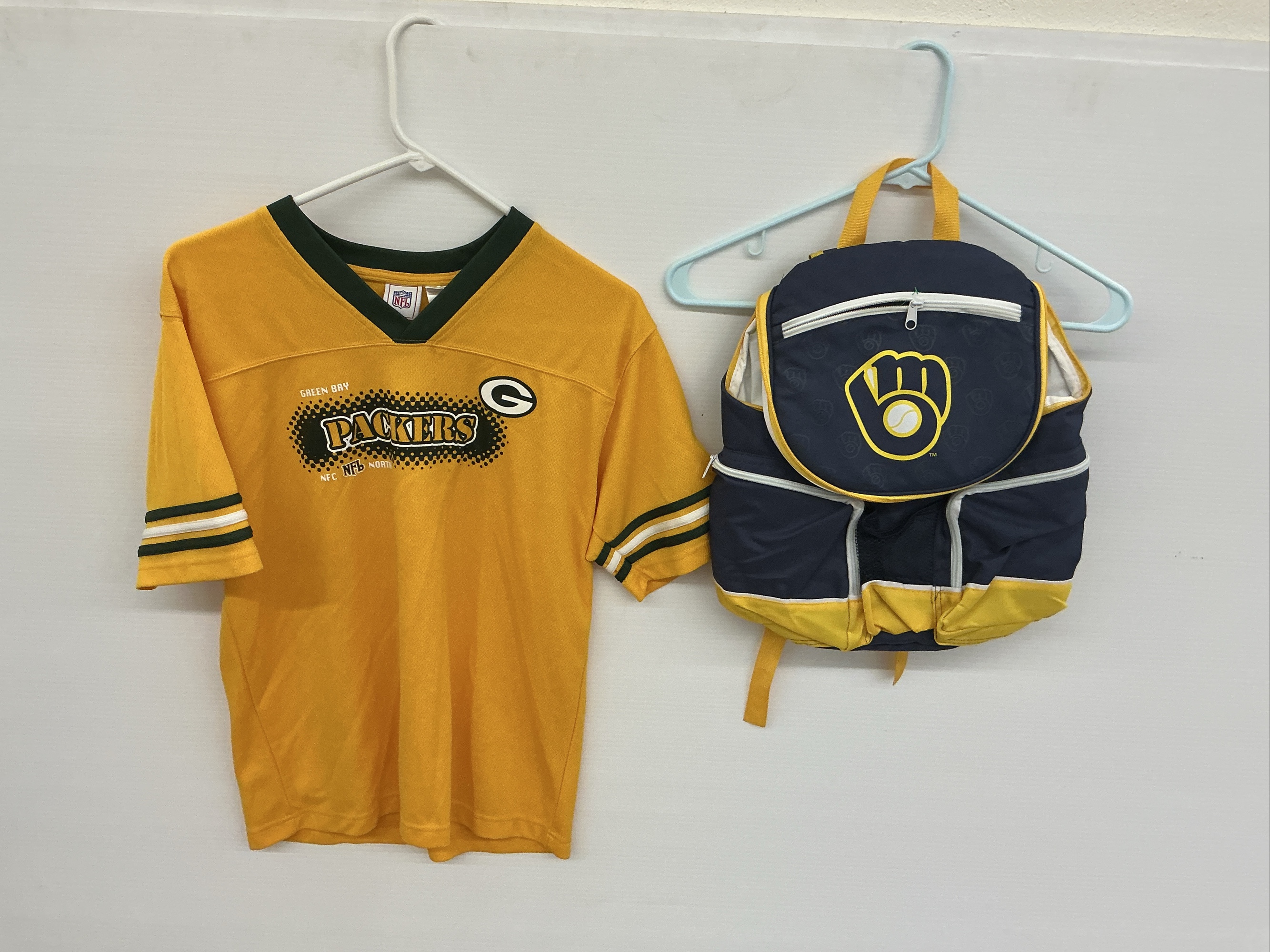 Up for auction is a Green Bay Packers Youth XL (16-18) NFL jersey and a Milwaukee Brewers baseball logo backpack. The jersey is yellow with green accents, and the backpack is blue and yellow.