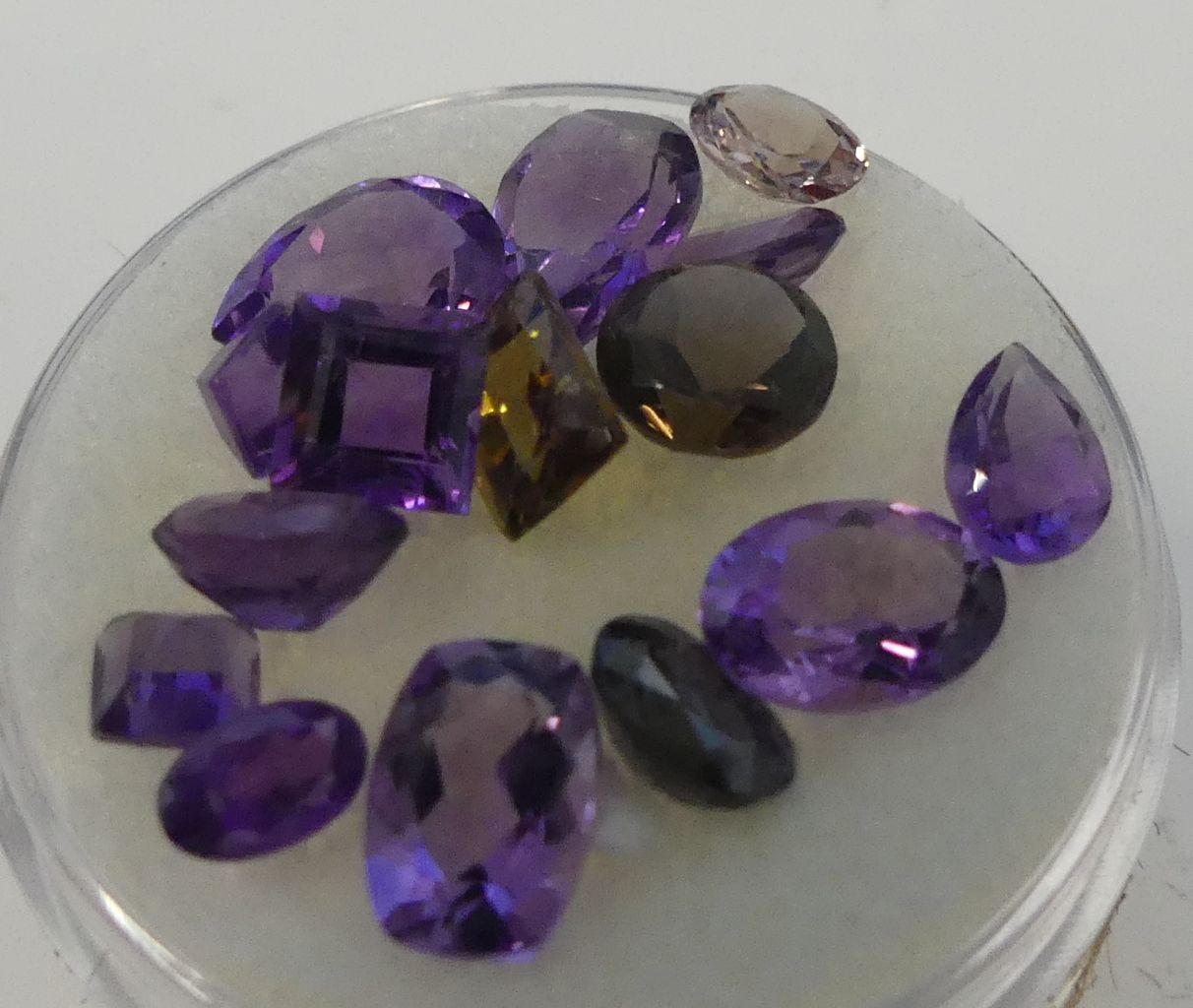 A collection of loose gemstones featuring various cuts and colors. Predominantly purple and brown shades, including Amethyst and Smoky Quartz. Shapes vary from oval, round, pear, and square.