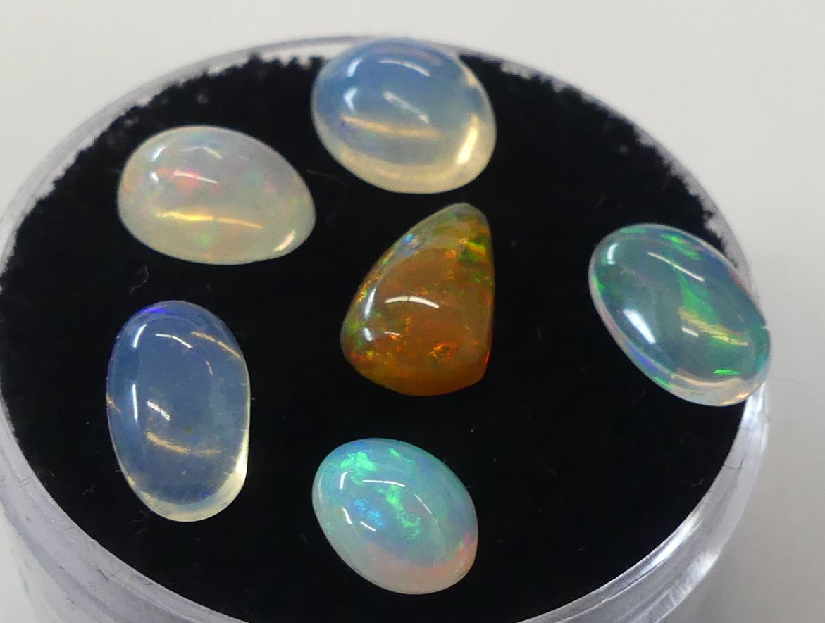Six beautiful opal gemstones of varying shapes and colors, showcasing their unique play of color.