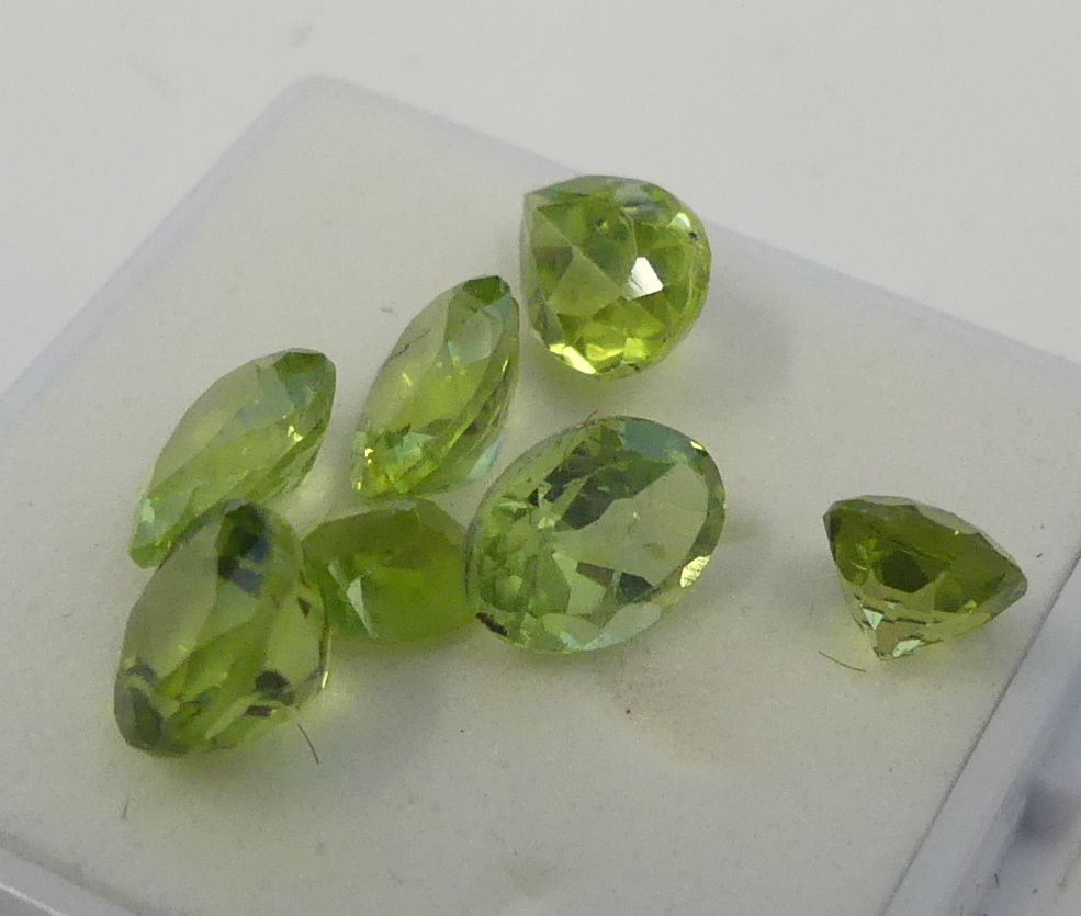 This lot features several loose peridot gemstones. The stones display various cuts, including oval, pear, and round shapes. The gems showcase a vibrant green hue and are displayed on a white surface.