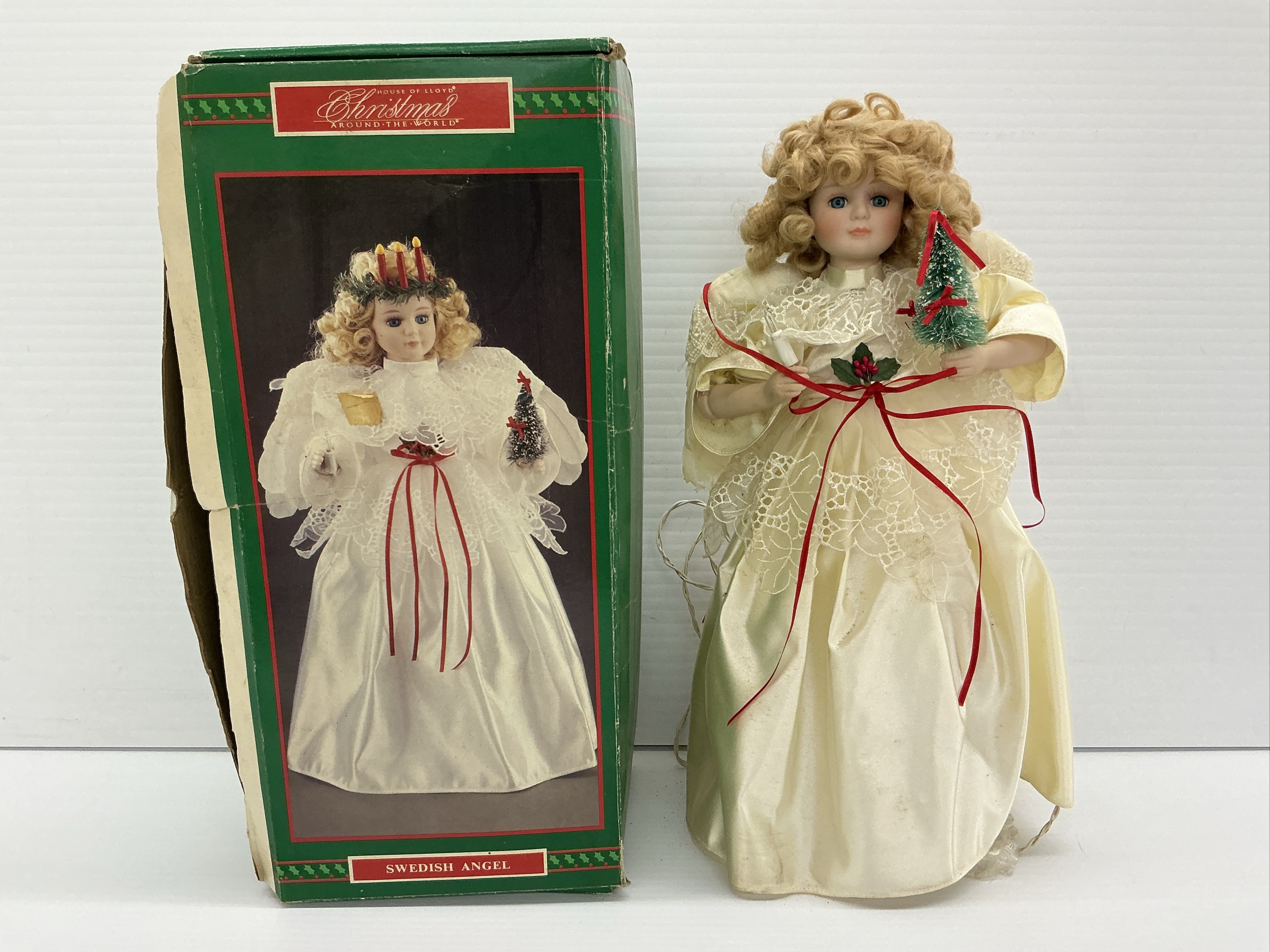 House of Lloyd Christmas Around the World collection, Swedish Angel doll tree topper, missing head wreath. Original Box. Dated 1992. 18 in. tall