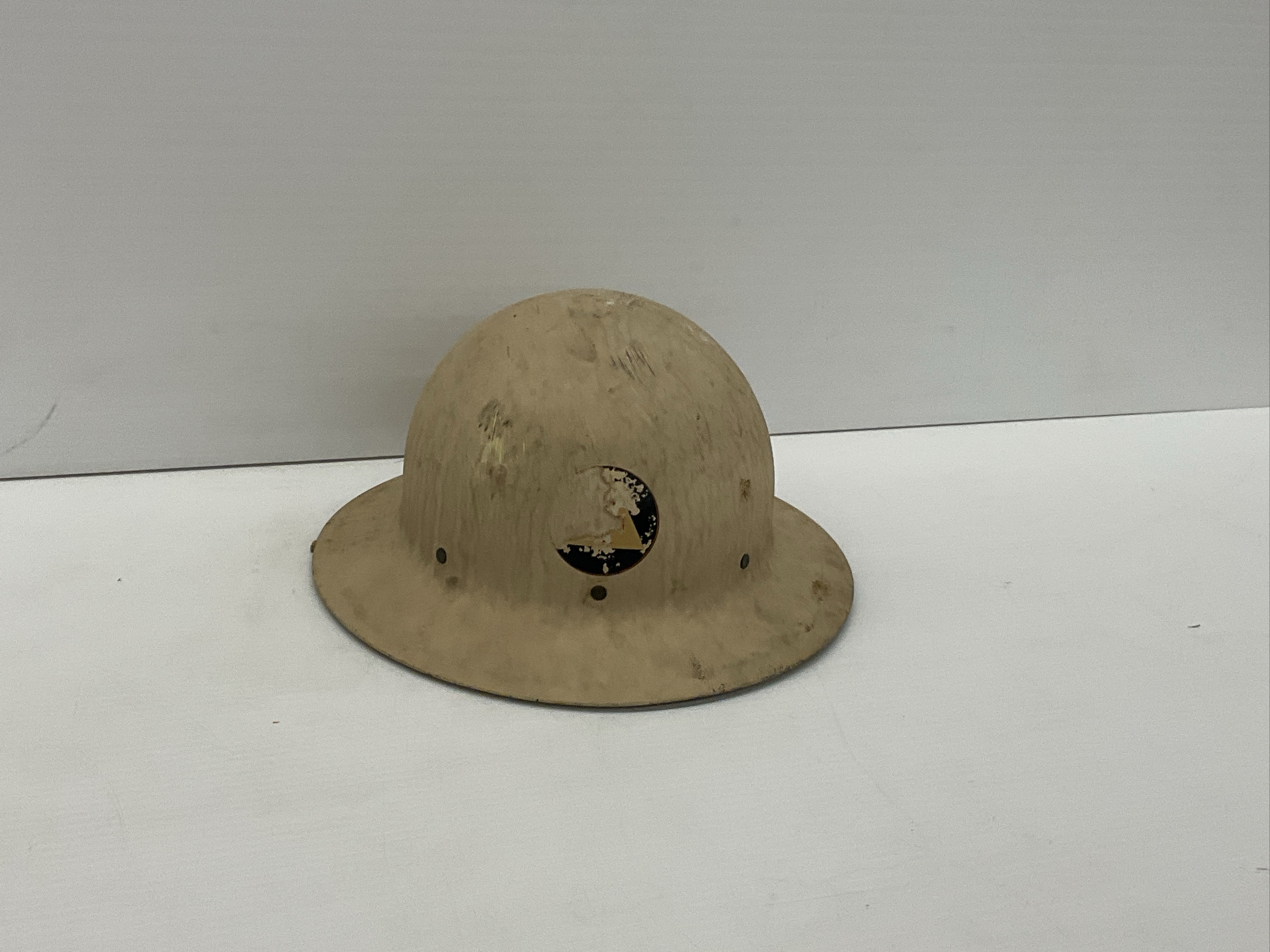 A tan helmet marked as U.S. Government property O.C.D. Features an emblem on the side and a leather/canvas interior. 7 x 12 x 14 in.