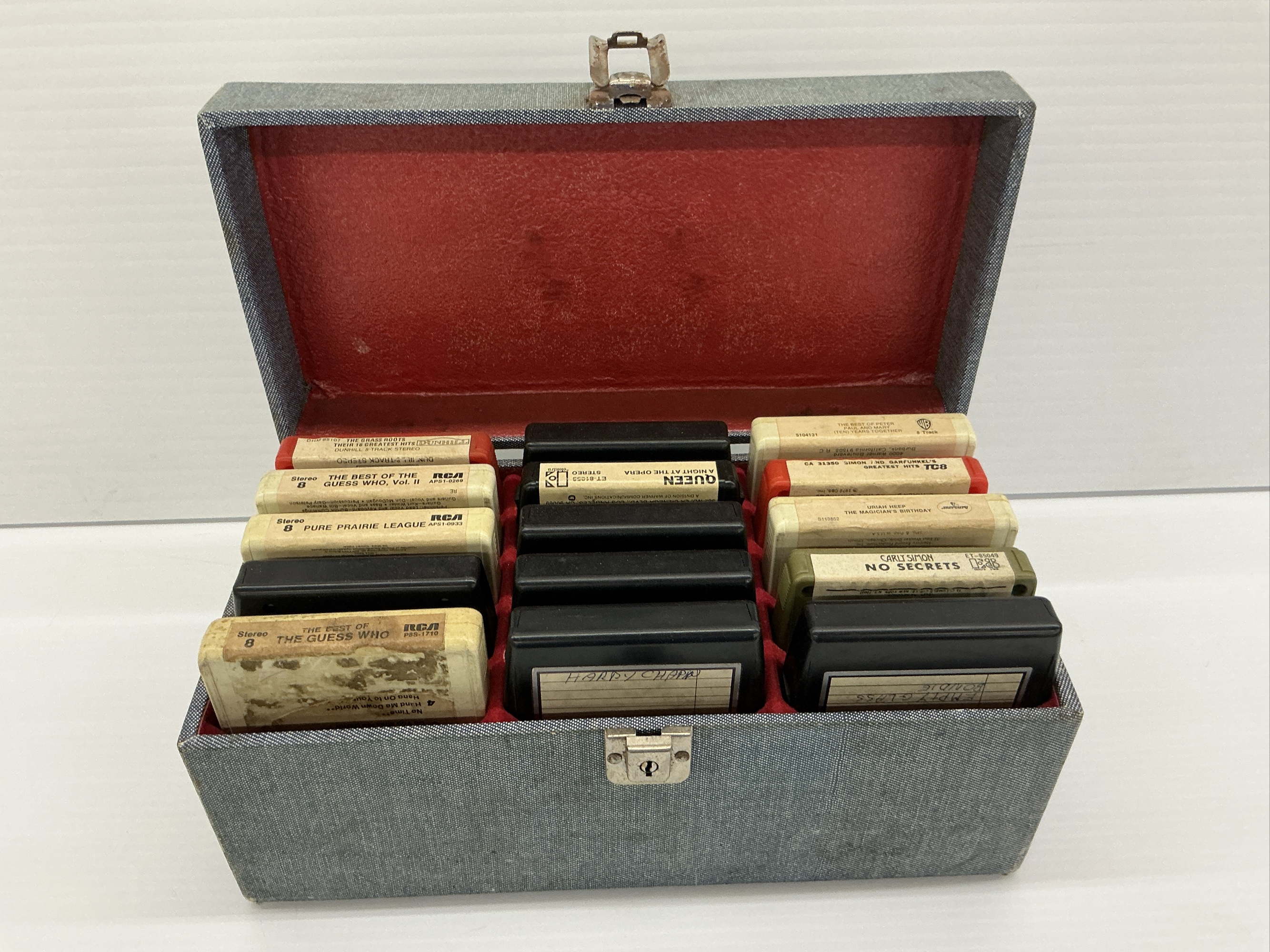 A collection of 8-track tapes with a carrying case. Tapes include artists such as Queen, The Guess Who, Pure Prairie League, Simon and Garfunkel, Uriah Heep, and Carly Simon. Case 6 x 13 x 6.5 in.
