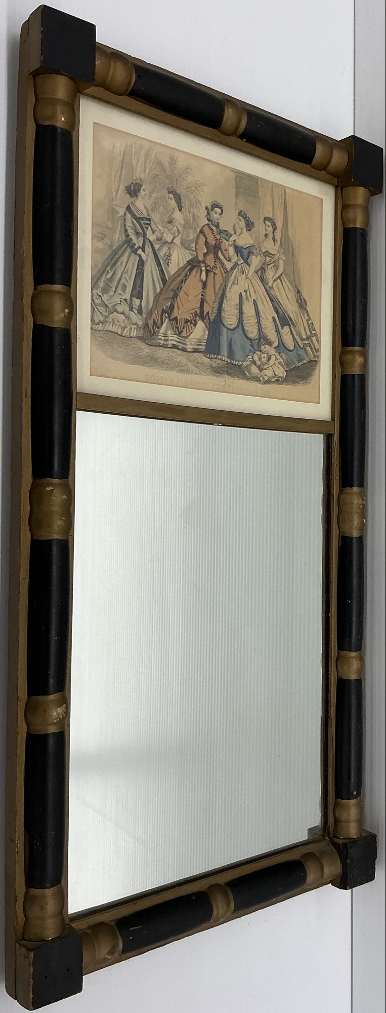 Framed mirror with a print of Godey's Fashions for February 1865. 31 x 15.25 in.