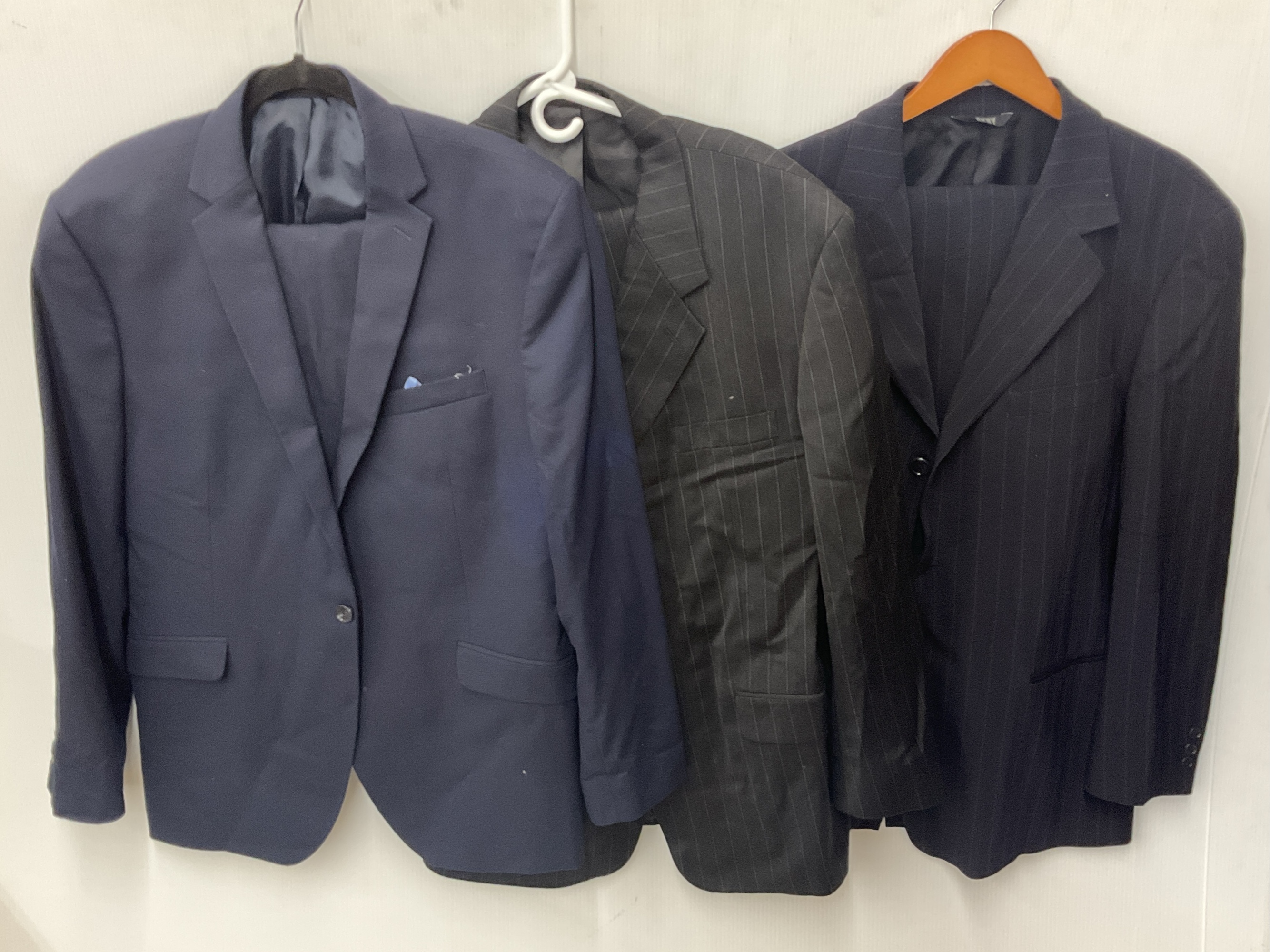 This lot includes three men's suits from brands like Reaction Kenneth Cole, Jones New York, and DKNY. The suits come in various sizes, including 42R, 46R, and 48R. One suit is a pinstripe pattern, while the others appear to be solid. The suits are made from a blend of materials including polyester and viscose.