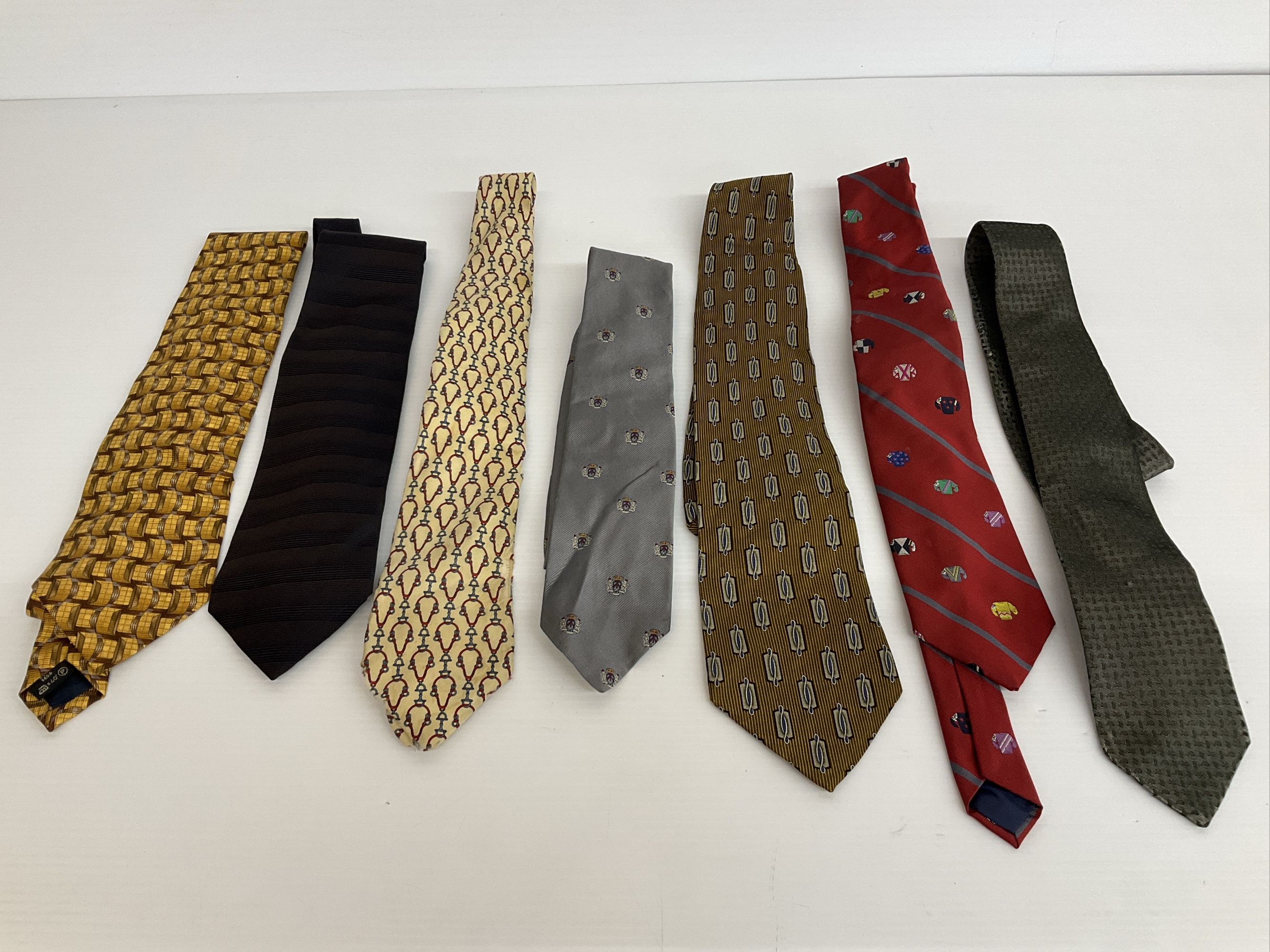 Group of 7 assorted men's neckties in various patterns and colors. Includes brands such as Ermenegildo Zegna, Banana Republic, Pierre Cardin, Resilio, Barry I Bricken, and Calvin Klein. A variety of styles for any occasion. Some discoloration.