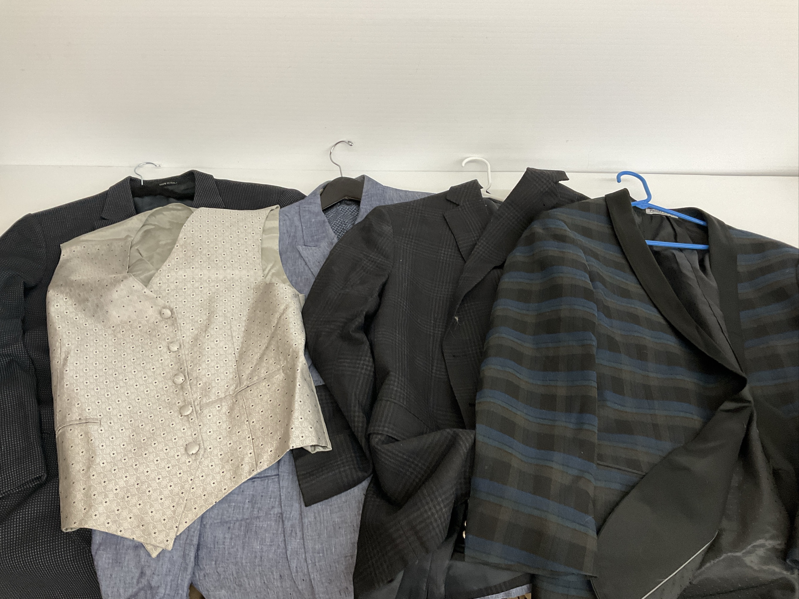 Collection of assorted men's designer blazers and vests, including Armani Collezioni, Brioni, Joseph Abboud (JOE), and Paisley & Gray. Includes blazers in various patterns and colors and one Brioni vest marked size XXXL.