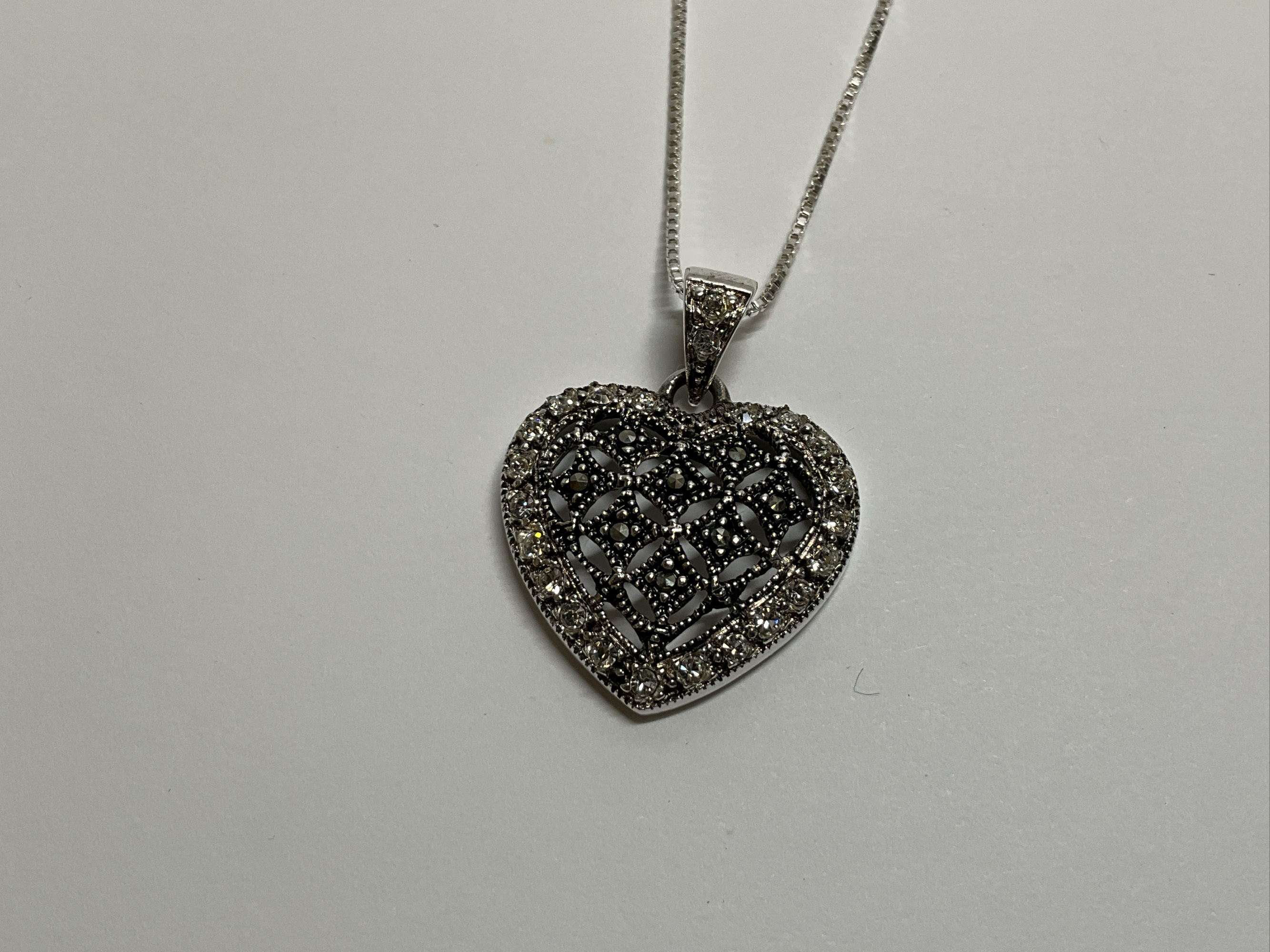 This is a beautiful sterling silver necklace. It features a heart pendant with marcasite stones.