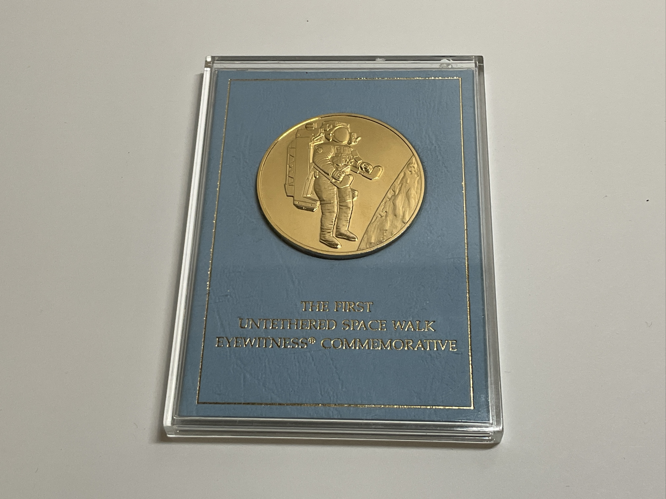 Commemorative coin celebrating the first untethered space walk. The coin is made of 24KT gold on sterling silver, issued as a limited edition by the Franklin Mint.