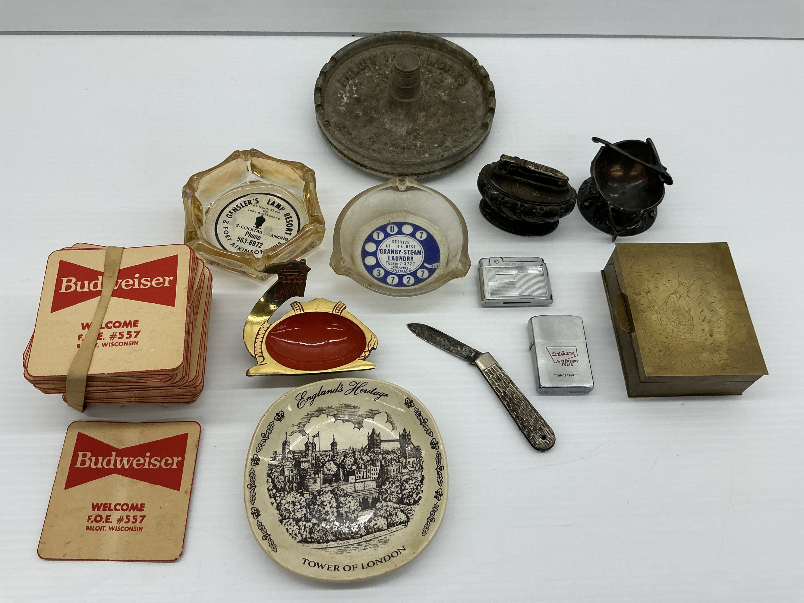 This mixed lot features a variety of collectibles, including several lighters (Bentley, Zippo, and others), ashtrays with various designs and advertising, a small decorative plate, Fraternal Order of Eagles (F.O.E.) Budweiser coasters, and a few other interesting items. See photos for details. Largest 6 x 6 in.