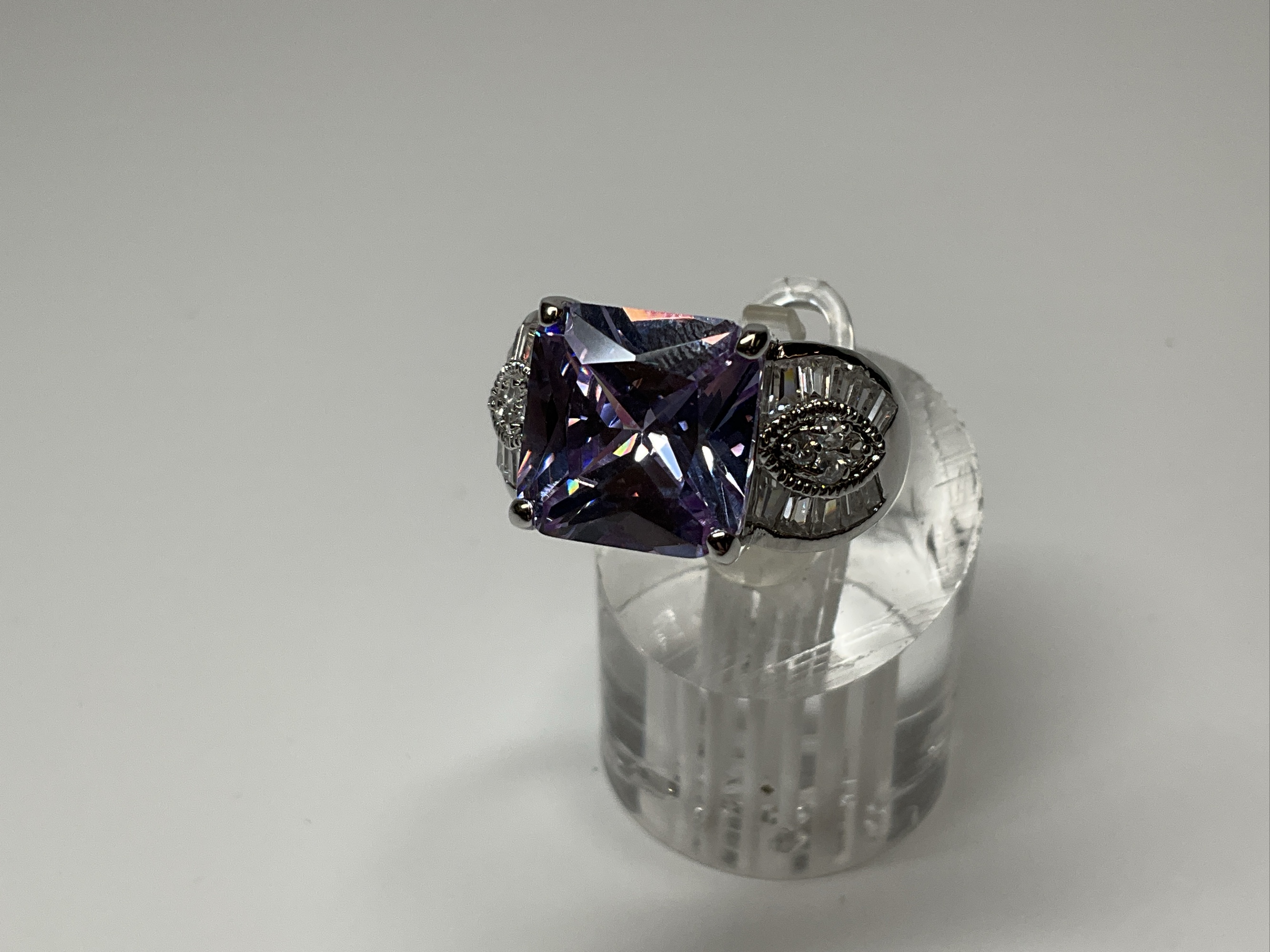 This is a beautiful sterling silver-tone ring designed by Nolan Miller. The ring is a size 8.25 and features a large, square-cut purple stone.