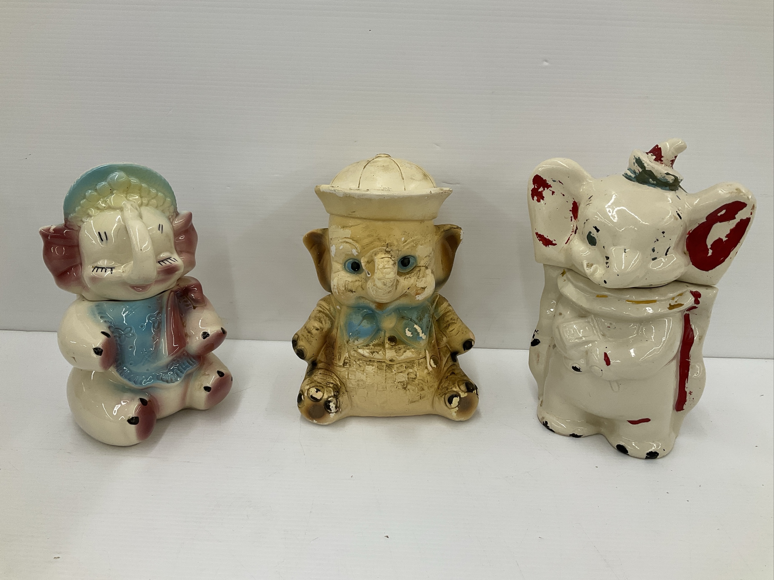 This listing features two vintage ceramic elephant cookie jars and a coin bank. Includes a 1940s Walt Disney Dumbo Turnabout cookie jar, an American Bisque elephant cookie jar and a chalkware elephant piggy bank (couple chips). Tallest measures 13 in.