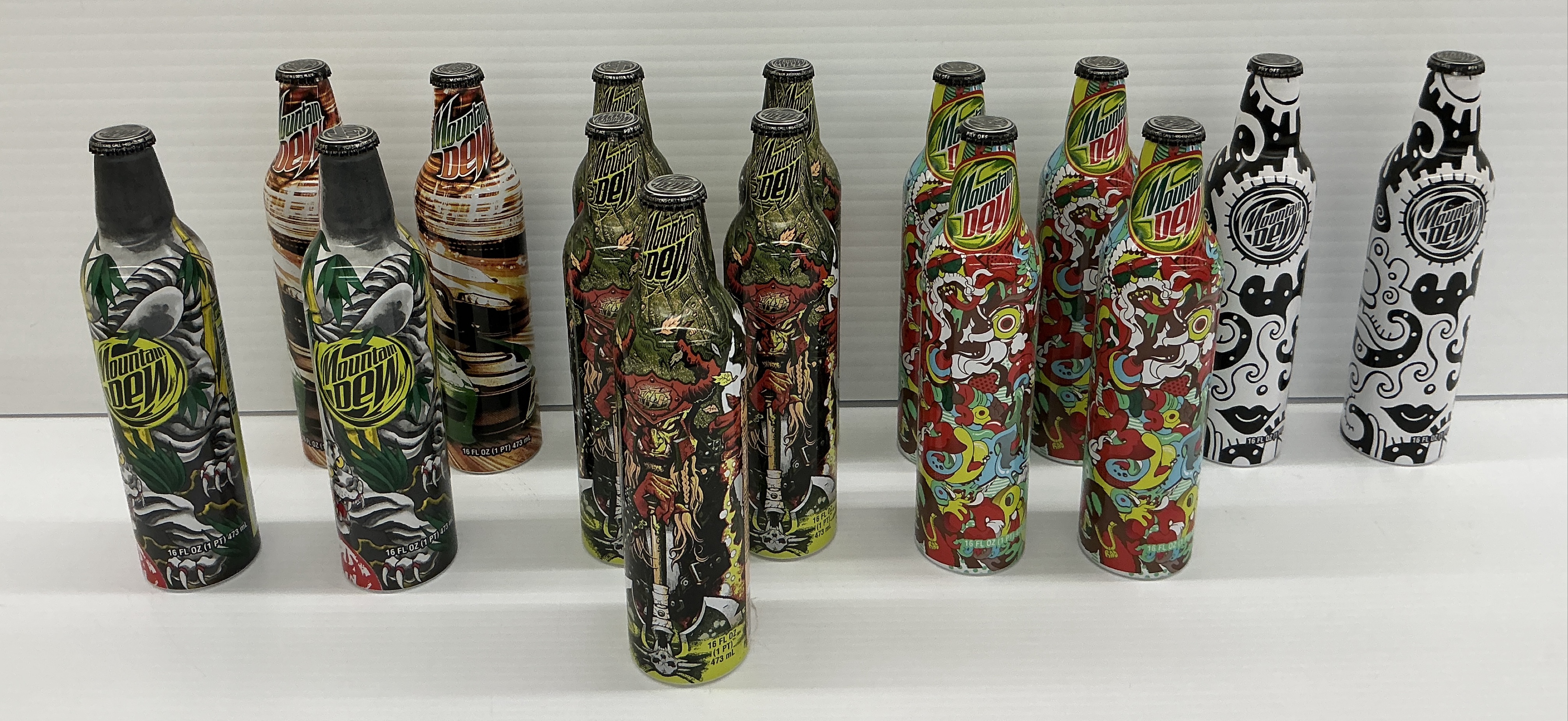 A collection of fifteen Mountain Dew aluminum bottles, each featuring a limited edition design. These are 16oz aluminum bottles with various graphics. All are unopened. 9.5 in. tall