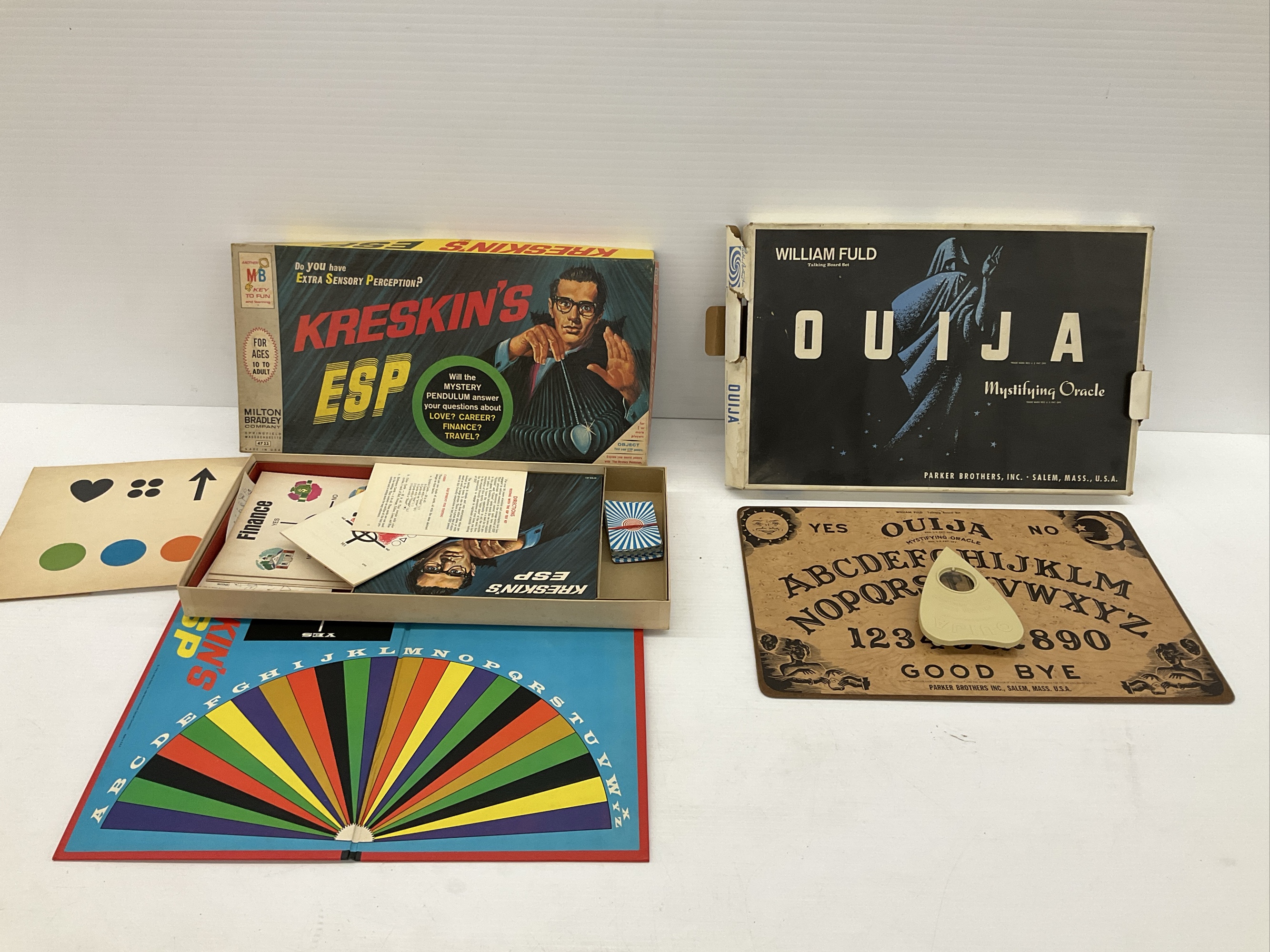 A collection of vintage games including Kreskin's ESP and a William Fuld Ouija board with planchette.