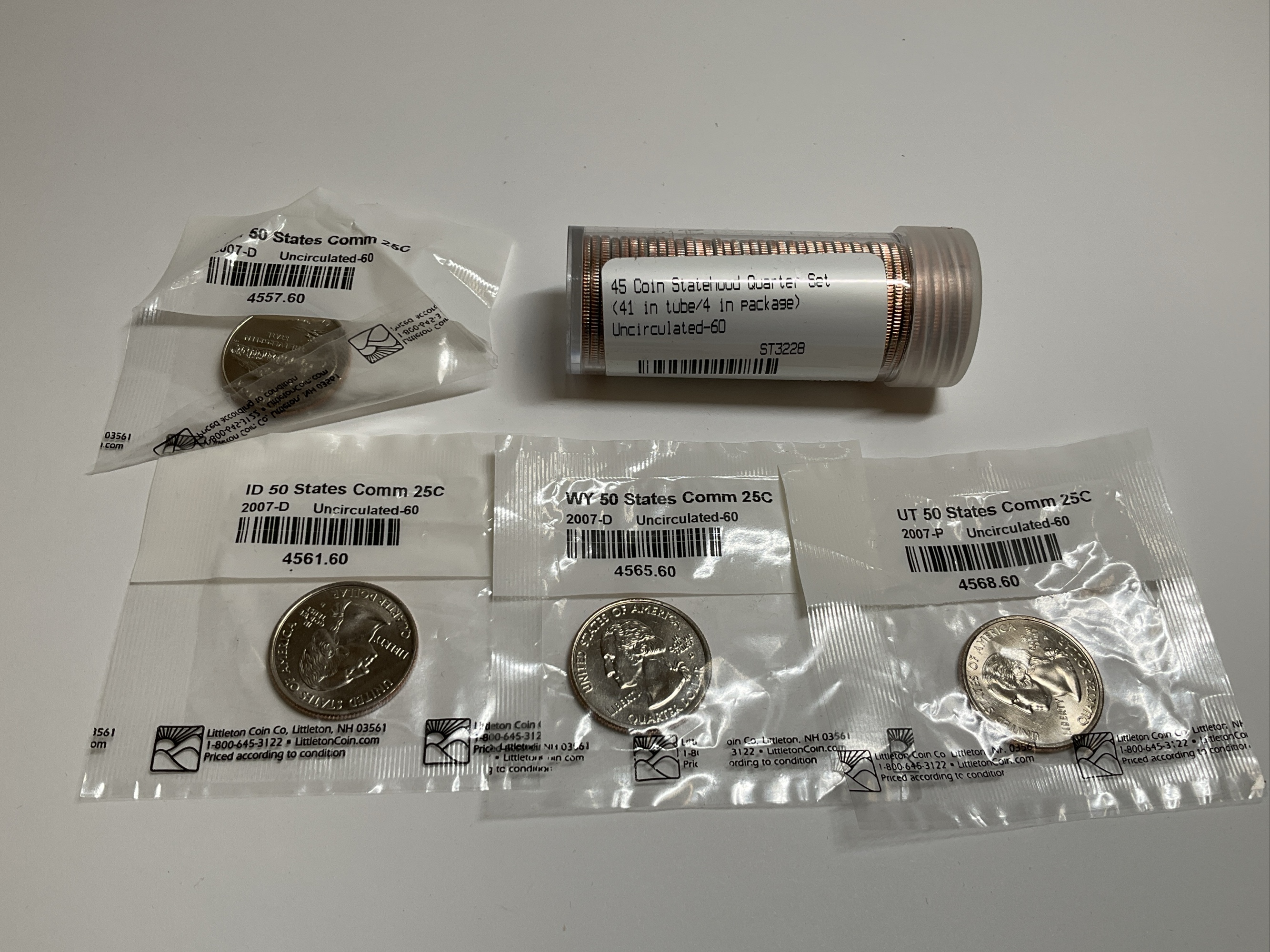 This auction includes a 45 coin set of State Quarters in tube, and additional individual state quarters. The individual quarters include states such as Washington, Idaho, Wyoming and Utah.