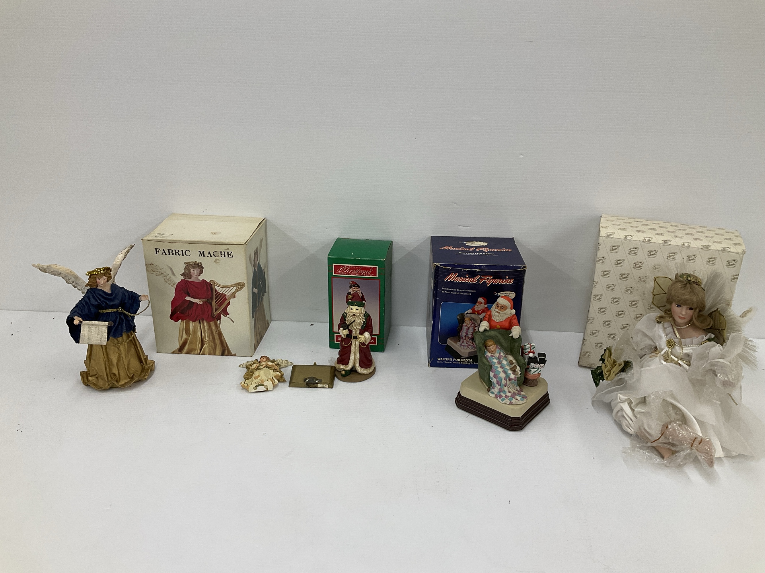 This listing includes a collection of Christmas decorations. Featured are a Fabric Mache angel figurine, a House of Lloyd Christmas Around the World Santa Claus figurine, a musical bisque figurine with a Norman Rockwell 'Waiting for Santa' scene, and a Celestial Fiber Optic Doll Celeste.