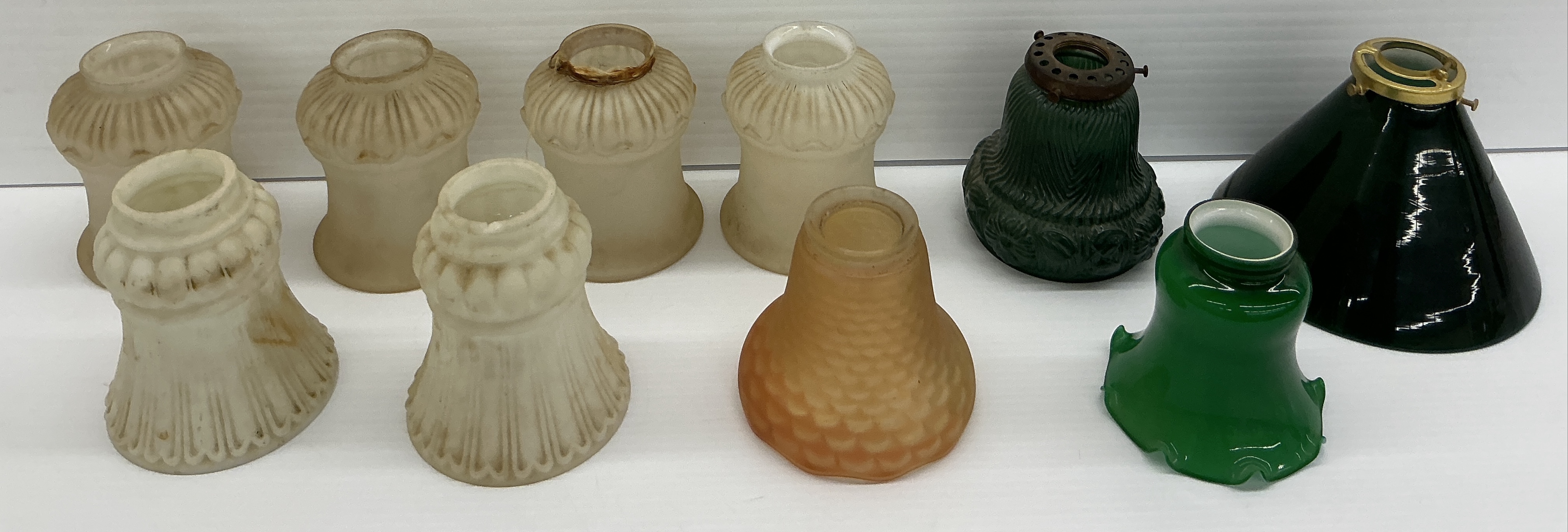 Collection of ten assorted vintage light fixture shades. Includes frosted white glass shades with textured patterns and green glass shades of various styles. Widest 7 in.