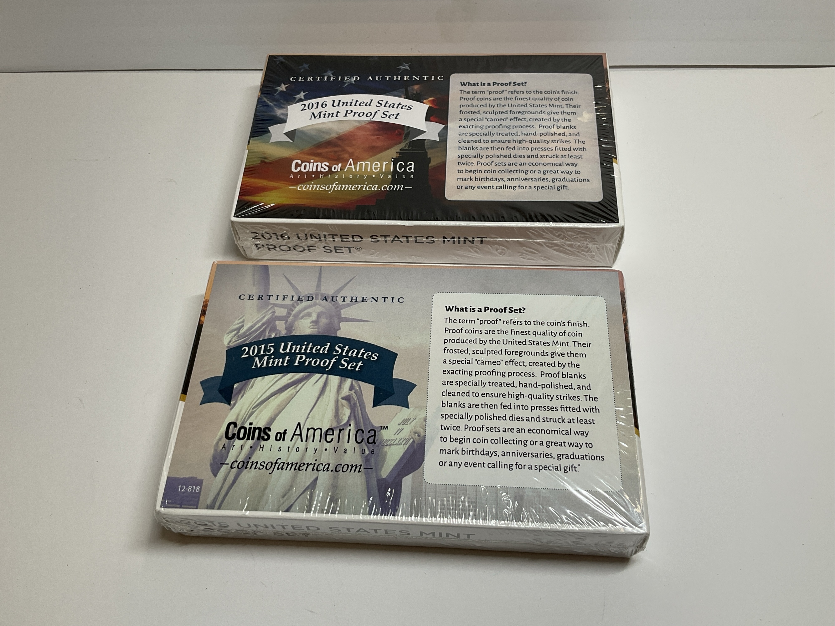 Two United States Mint Proof Sets, one from 2015 and the other from 2016. Both sets are packaged in Coins of America boxes and contain various US coins.