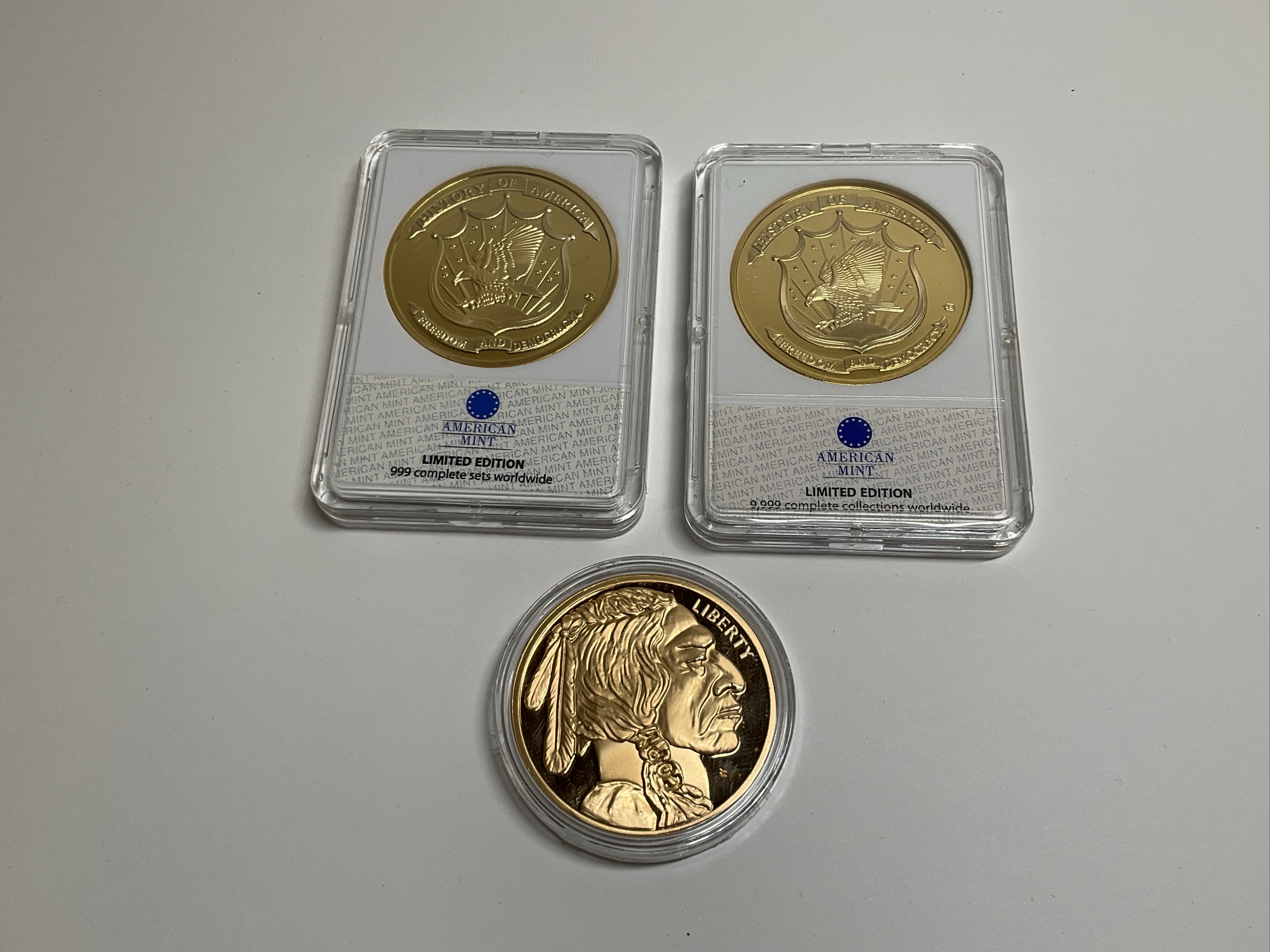 Two-piece collection of 'Symbols of Freedom' archival coins, each layered in 24k gold. These proof quality coins, measuring 40mm in diameter, showcase iconic American symbols such as the Statue of Liberty, and the Star-Spangled Banner. Also includes a copy of the American Buffalo coin.