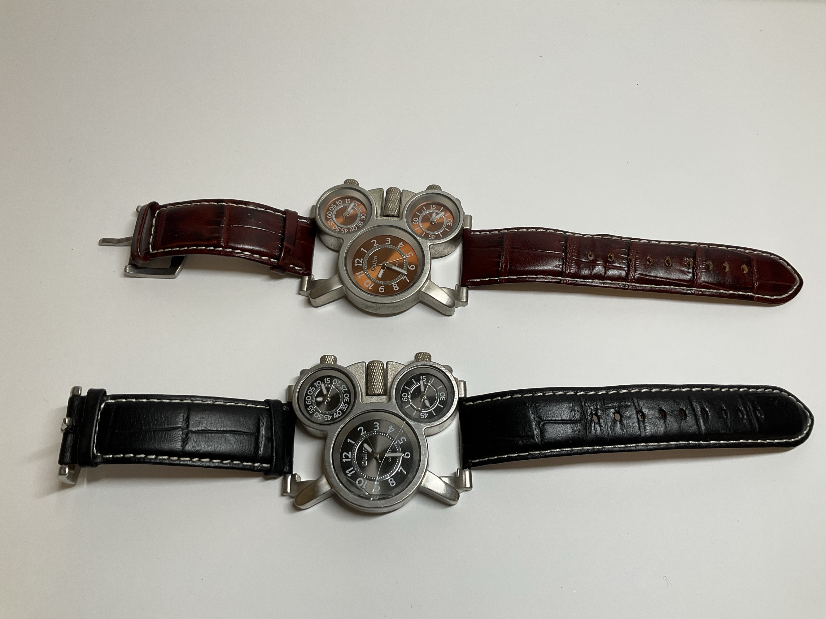 This lot features two unique watches designed by Oulm of Italy. The watches are each equipped with three separate dials allowing for viewing of multiple time zones, and have leather bands. One has a cracked crystal. We do not guarantee watches to run.